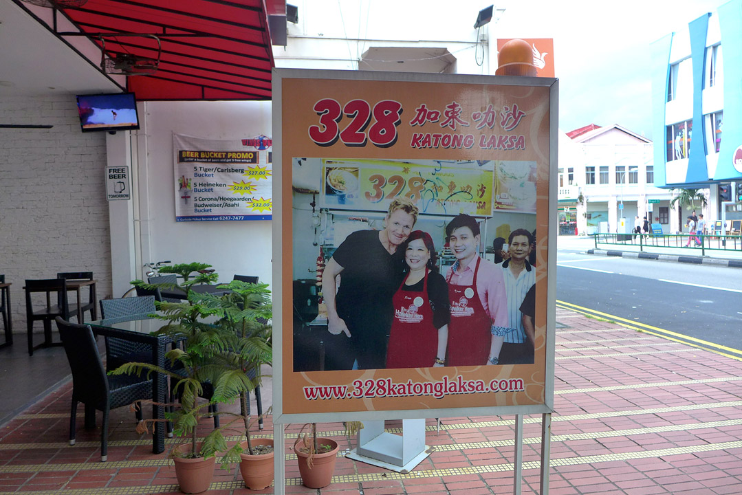 Men under av alle under! Hva sto det på skiltet tvers over gaten, mon tro? Jo, 328 Katong Laksa! Å, himmel! Tenk om vi hadde satt oss ned og spist på det triste hjørnet og så etterpå sett at restauranten vi lette etter lå på andre siden av gaten?