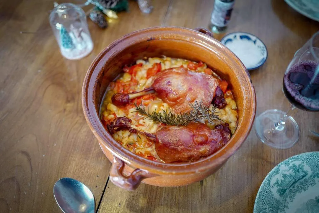Hos den lokale slakteren i Cadaques hadde vi kjøpt inn to konfiterte andelår «for a rainy day» og et glass med hvite bønner. Da har du nesten det meste du trenger. Med en kvast rosmarin, som vi har plukket i naturen (de vokser overalt i Cadaques), noen tomater, litt krydder og en slant hvitvin har du alt du trenger til å lage den beste koseretten jeg vet om, nemlig confit de canard (andeconfit).