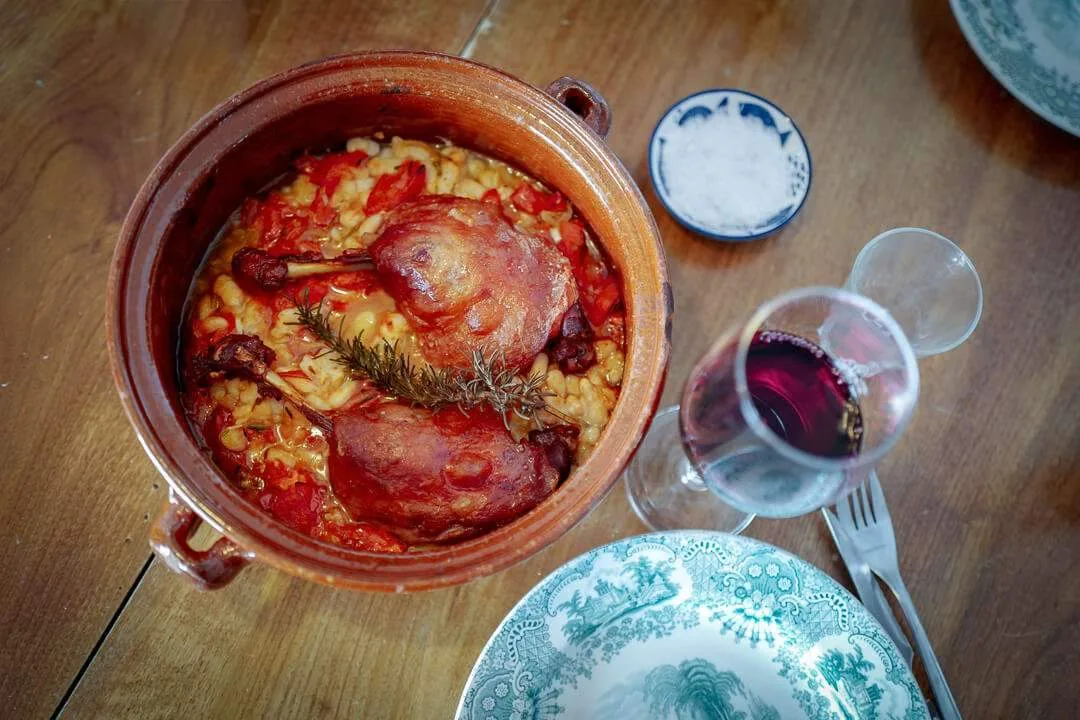 Hos den lokale slakteren i Cadaques hadde vi kjøpt inn to konfiterte andelår «for a rainy day» og et glass med hvite bønner. Da har du nesten det meste du trenger. Med en kvast rosmarin, som vi har plukket i naturen (de vokser overalt i Cadaques), noen tomater, litt krydder og en slant hvitvin har du alt du trenger til å lage den beste koseretten jeg vet om, nemlig confit de canard (andeconfit).
