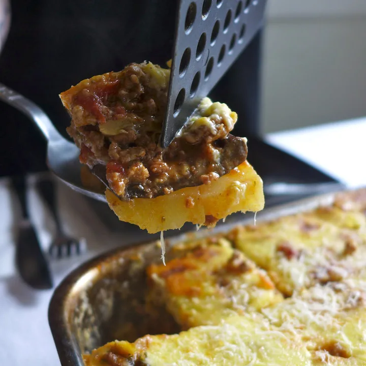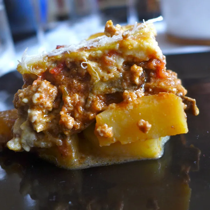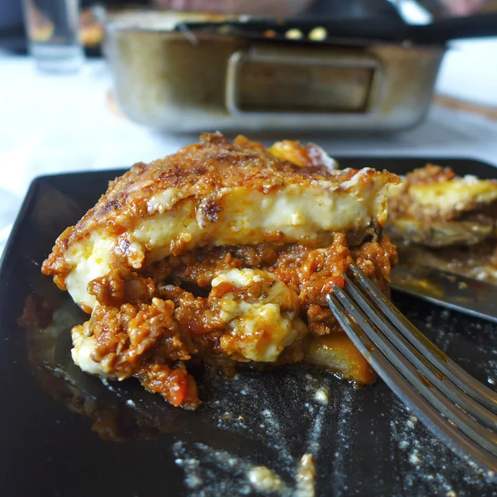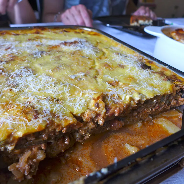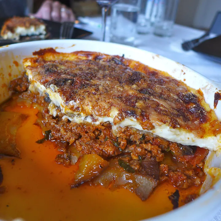 Det er poteter i bunnen. Skivene er ganske tykke og noen er litt harde i konsistensen. Auberginskivene er perfekte og kjøttet smaker deilig av kanel – akkurat som en moussaka skal. Når du skjærer et stykke av moussakaen, står den fint på tallerkenen, men den væsker litt av tynn tomatsaus. Bechamelsausen er smakfull av ost (her er det valgt parmesan) og muskat, men laget er litt tynt. Alt i alt er alle enige om at dette er en knallgod moussaka.