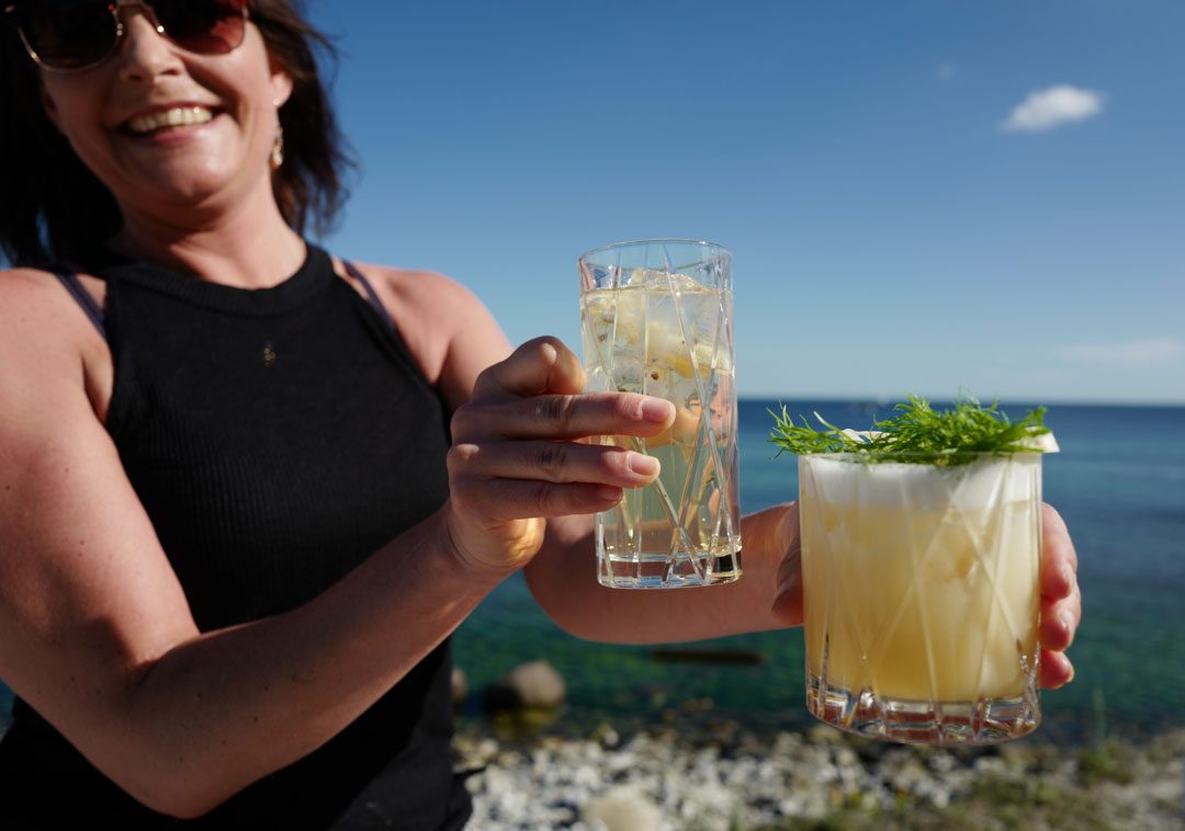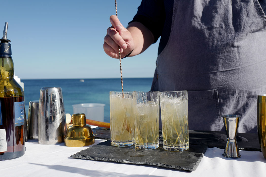 Disse cocktailene kan du selv lage: Til venstre: Talisker tonic & Pepper: 50 ml Talisker Storm, 150 ml tonic, 1 knivspiss malt grønnpepper. Fyll et glass med isbiter. Hell på Talsiker Storm og tonic. Dryss pepper over. Til høyre: Taliskers signaturdrink: Talisker Made by the Sea Sour: 50 ml Talisker Skye, 25 ml limesaft, 15 ml sukkersirup (50/50 sukker og vann kokes opp), 3 dasher med celleribitters, 1 eggehvite, fennikelbusk til pynt. Ingrediensene shakes i en shaker fylt med is. Sil i et glass og pynt med frisk selleribusk.