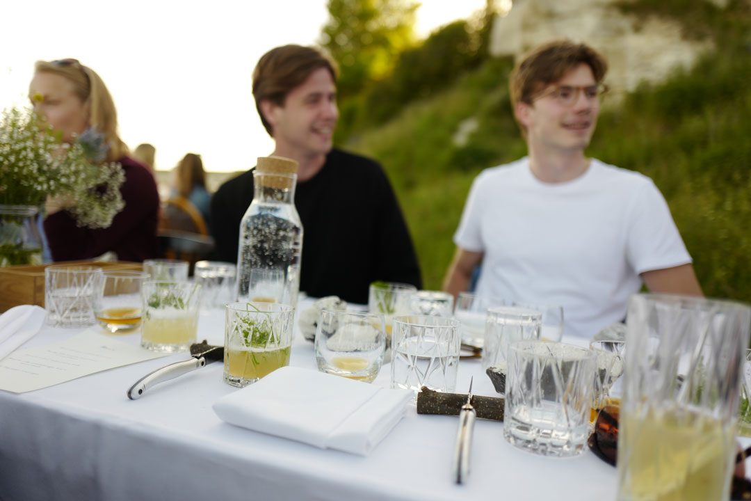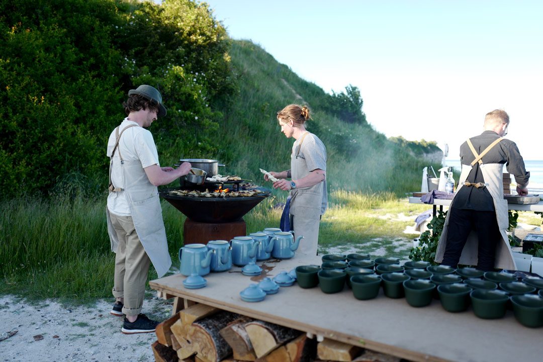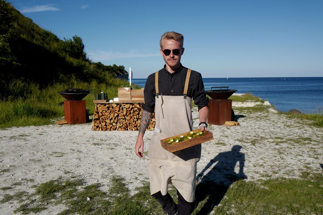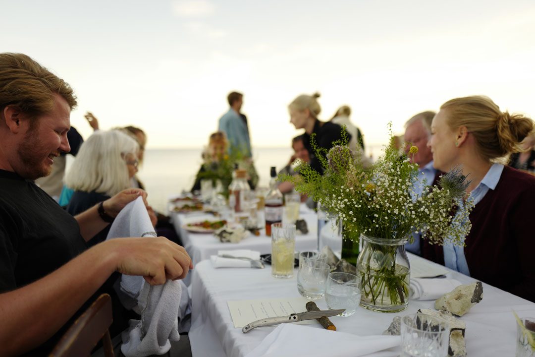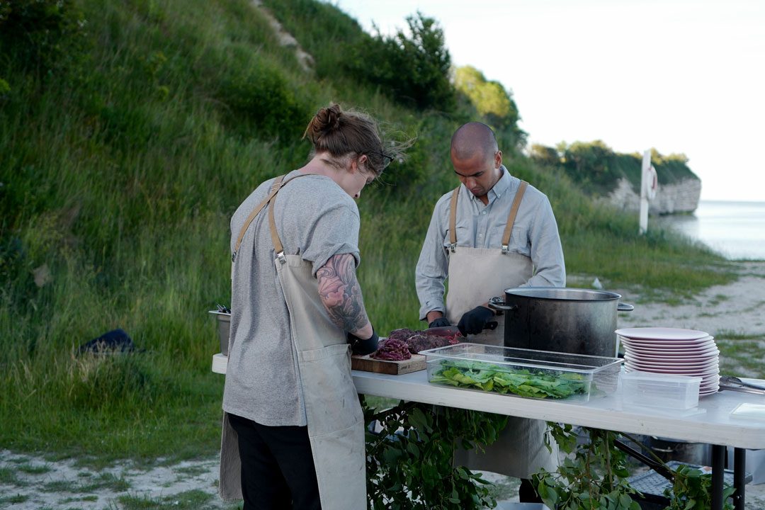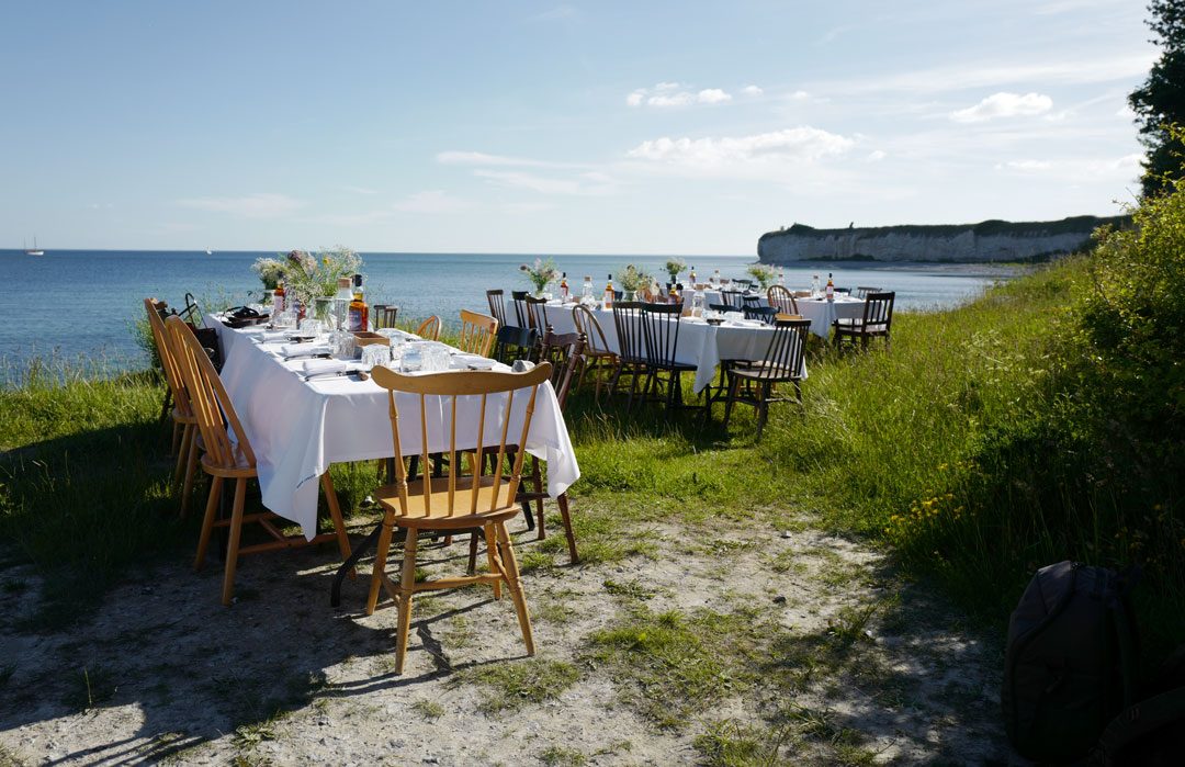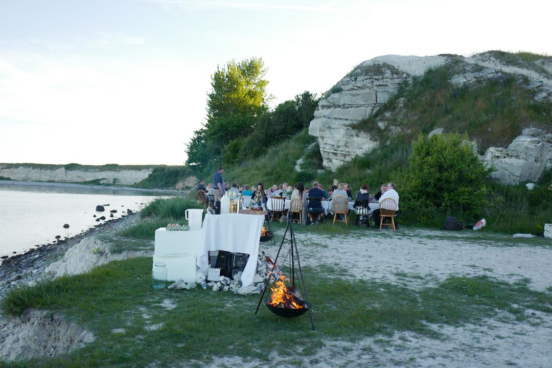 Vi blir plukket opp av taxi og kjører en times tid sør for København. Vi skal til Stevns Klint der det på stranden er dekket opp til sommerfest. Maten står de flinke kokkene fra restaurant Agrikultur i Stockholm for.