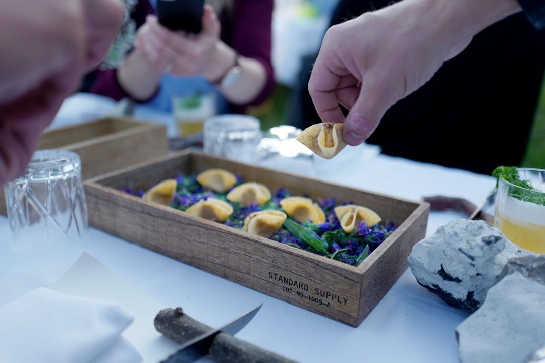 Første snack: Tørket mose med kantarellkrem, granskudd og blomster. Nydelig krøsnj og fantastisk aromatisk krem som tilsammen smakte som skandinavisk skog.