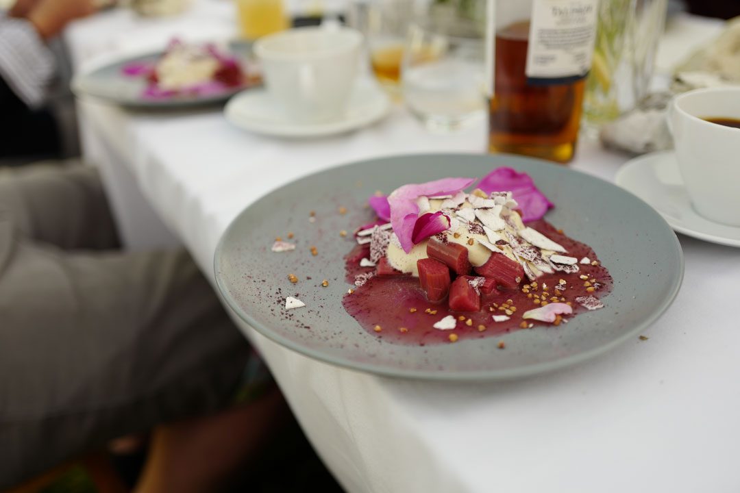 Desserten er servert: Rabarbra, rose, marengs og langpepper.