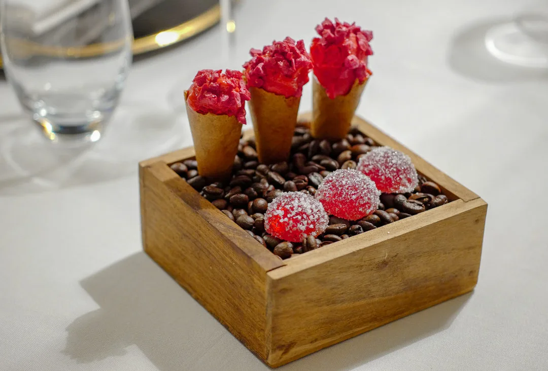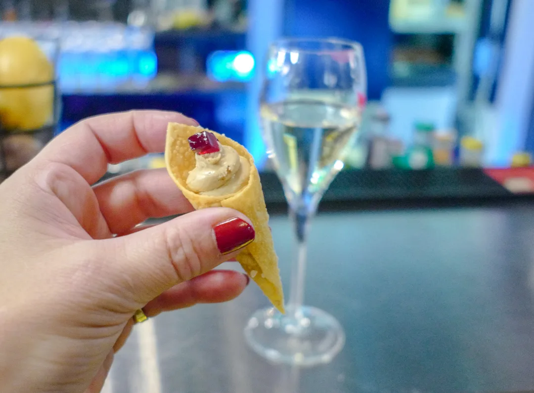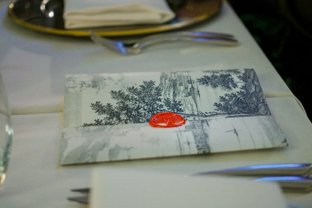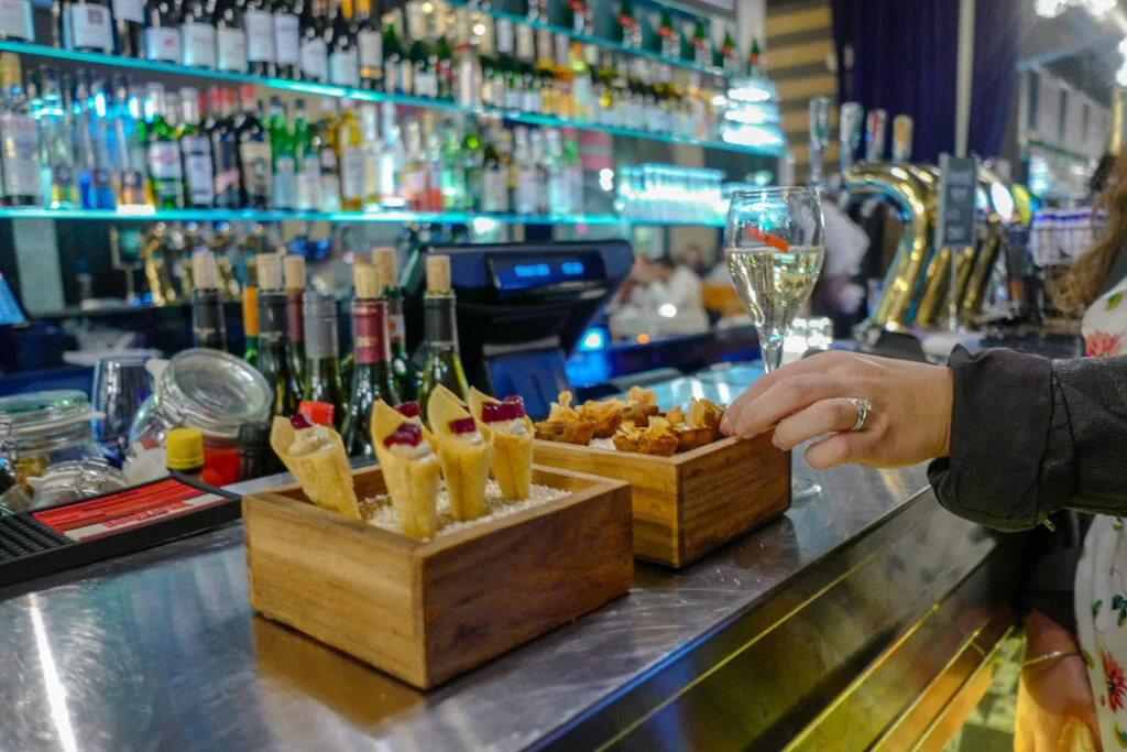 Vi starter med champagne og et par småretter i Brasserie Park før vi går inn i matsalen i nabolokalet.