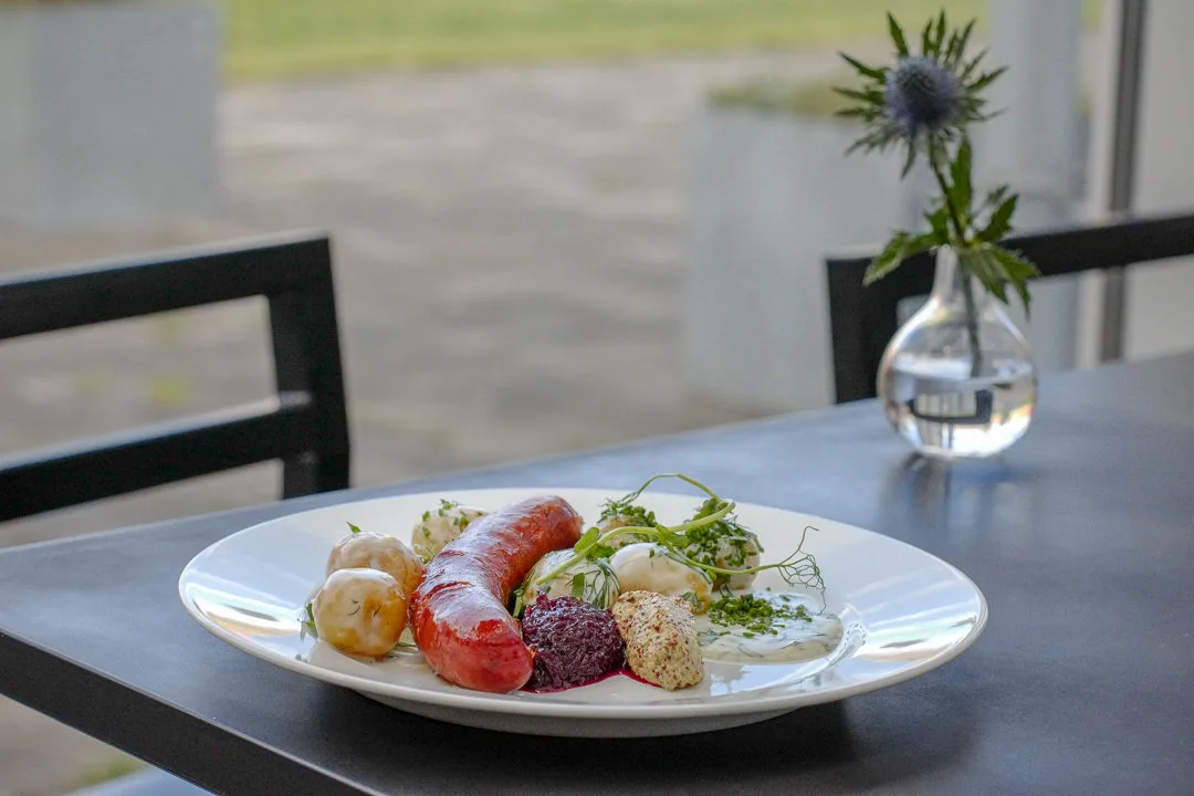 Syltan byr på rimelige og bra retter og jeg prøver en lokal spesialitet som heter smålands isterbrand. Dette er en svinepølse fylt med gryn, servert med sennep, rødbeter og poteter i hvit dillsaus. Veldig spesiel konsistens på pølsen pga grynet, men veldig godt og ekstremt mettende.