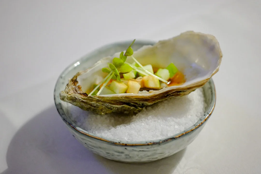 Første rett er en fantastisk østers som er lett varmebehandlet og servert med små epleterninger, soyasaus og brunt smør. Det er en perfekt kombinasjon og smakene kler østersen perfekt. Er du ikke superglad i østers kan jeg nesten påstå at du vil like denne versjonen.