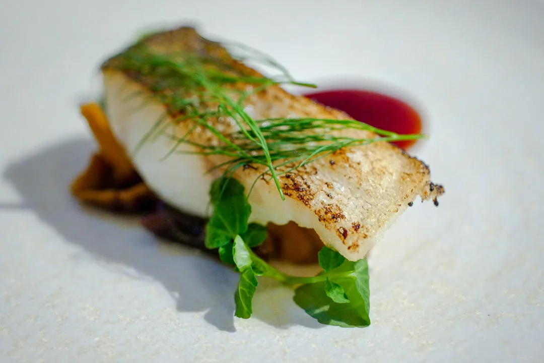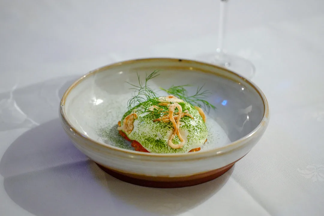 Vi får en helt vidunderlig sjøkrepsrett. Ja, det er en råvare som er vanlig å se på nordiske restauranter, og det skjønner jeg godt, for dette er en råvare som er noe av det beste som penger kan kjøpe. Versjonen vi får er spektakulær. Sjøkrepsen er faktisk servertsom rå tartar med krondill, potetskive, potetskum, fritert løk og ørretrogn. Den er så spennende og god. Jeg kan ikke huske å ha spist noe lignende før, faktisk.