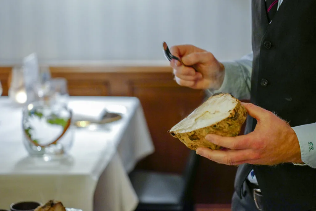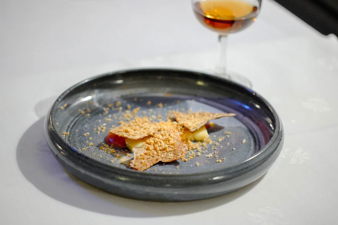 Osteretten er en ost fra Brostorp servert med fennikelbrød, fermenterte plommer og revet hasselnøtt. Lekker liten sak. Jeg blir så glad når jeg får litt ost i en tastingmeny. Jeg synes den passer naturlig inn her.