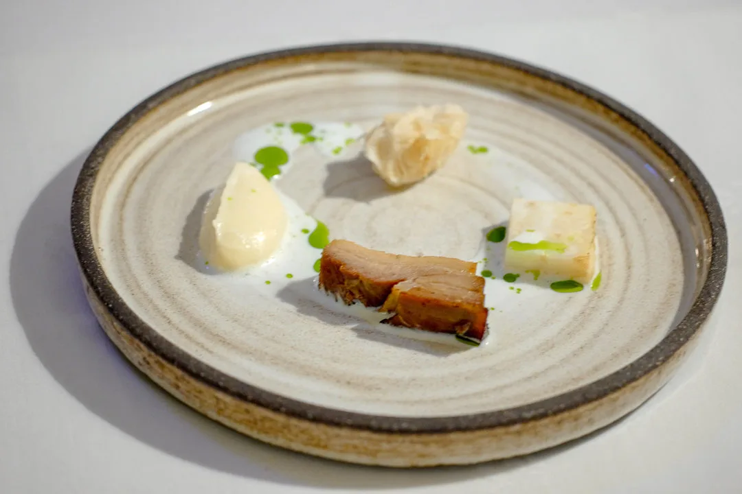 Så er det selleriroten som er stjerna. Her serveres den på tre forskjellige måter med et vidunderlig stykke svinekjøtt som kommer inn på en brennende planke. Retten serveres med syrnet saus og urteolje.