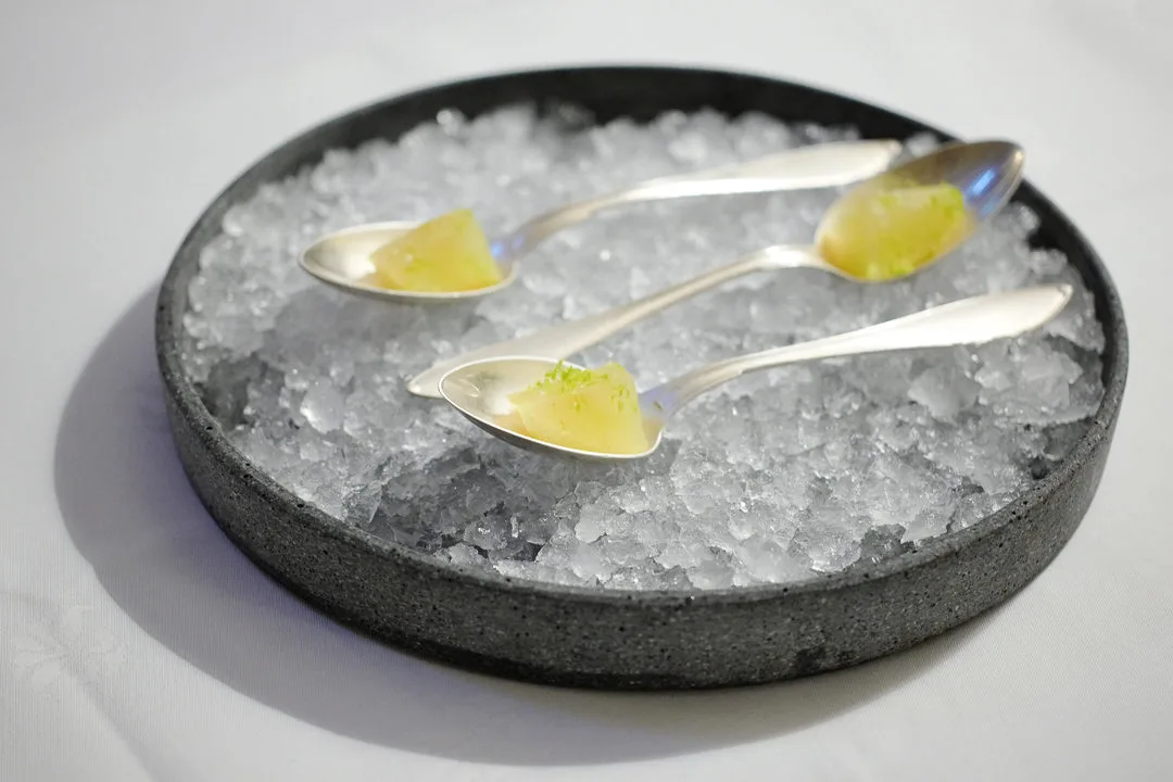 Etter dette får vi en ganerenser. Og hva er da bedre enn å skjefull av spritmarinert eple med salt? Skal si den renser opp.