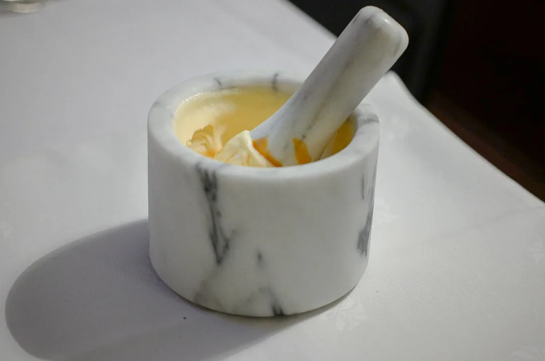 Så er det meningen at vi selv må jobbe litt for maten. Vi får servert hver vår iskalde morter i marmor. I den helles en væske. Nå skal vi røre. Vi rører og rører og vipps har vi iskrem!