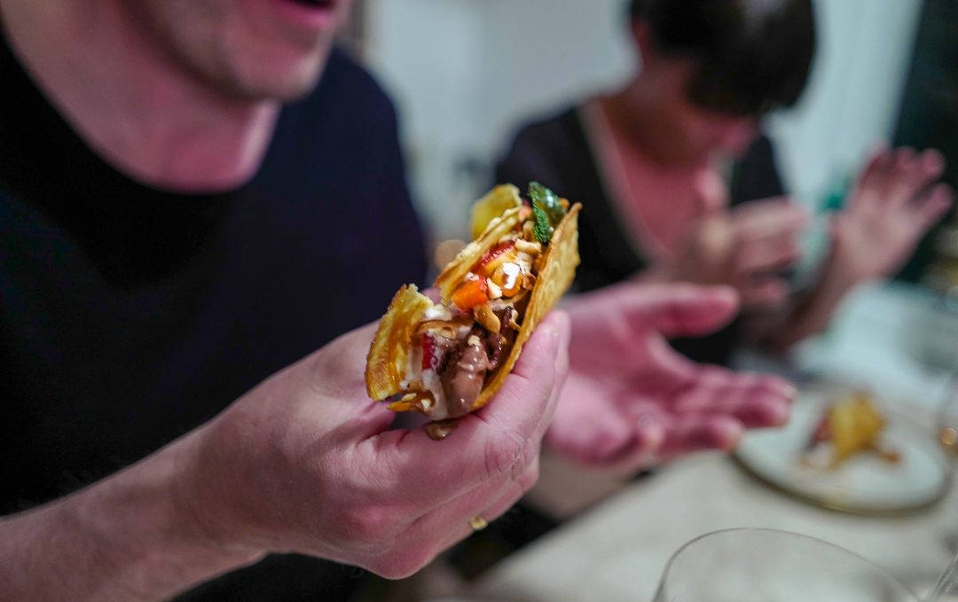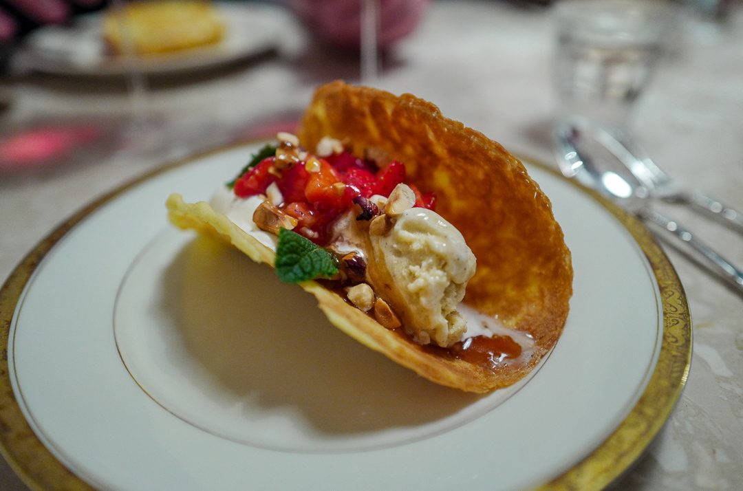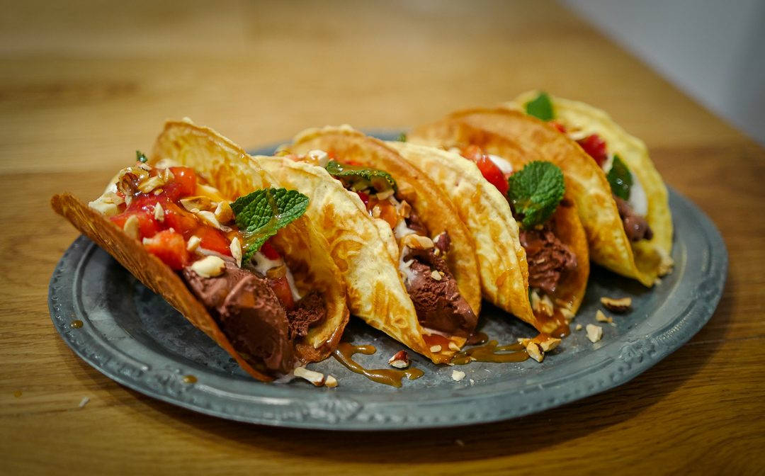 Hva serverer jeg i tacoen? Jo, jordbærsalsa, iskrem, mynteblader, sistede hasselnøtter, whiskykaramell og pisket krem.