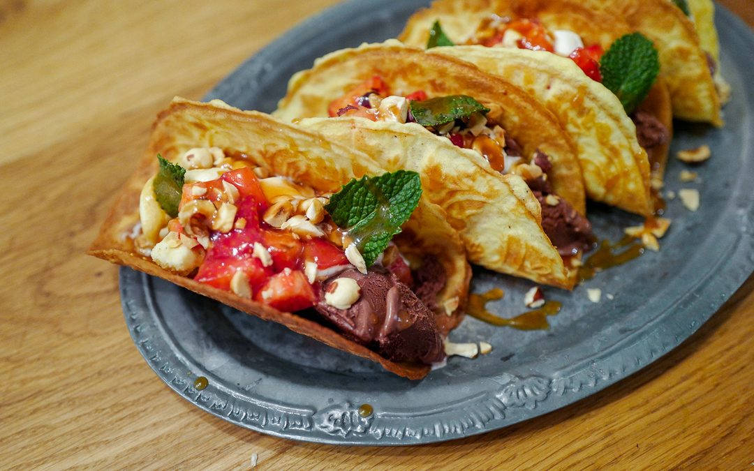 Jeg ble så inspirert etter å ha vært på matfestival i Dubai i vinter. Der fikk jeg nemlig dessert-taco! Og for en fantastisk idé det er!