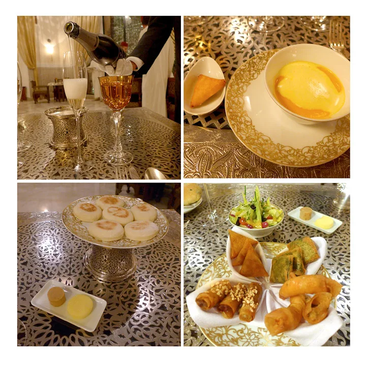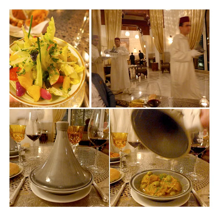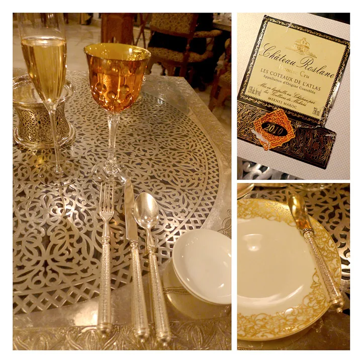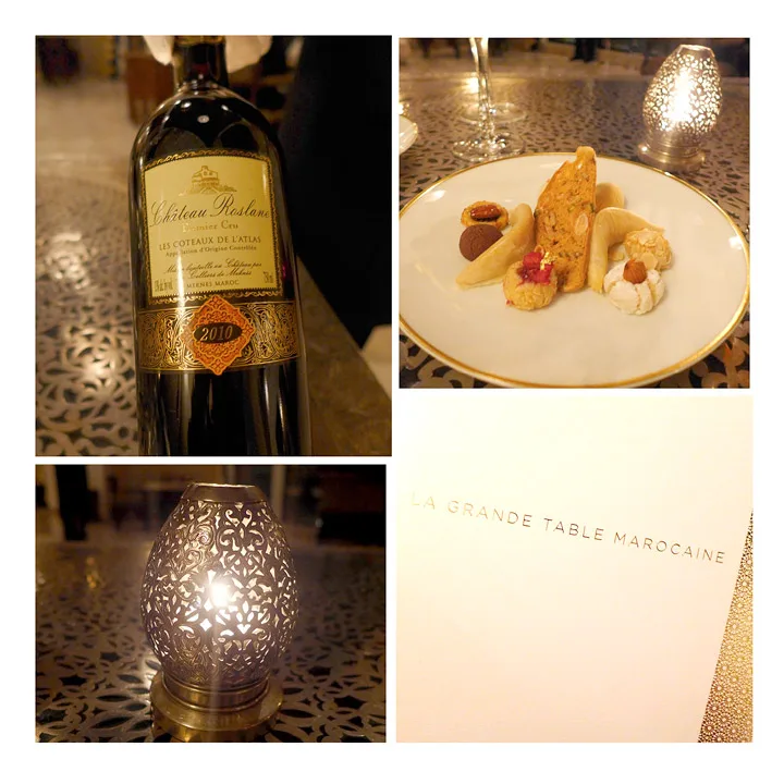 Vi kommer tll restauranten og blir plassert ved et deilig bord med god avstand til neste bord. Det er 4-5 kelnere per bord og de er kledd i hvite kjortler, hvite hansker og fez på hodet. Lokalet er dekoret med de flotteste marrokanske detaljer i messing og krystall. Vi blir tilbudt et glass champagne hver (til en pris av ca 400 kr per glass viser det seg etterpå). Det smaker godt. Skulle bare mangle. Vi studerer menyen og bestememr oss for å dele en forrett og så tar vi en tajine hver til hovedrett. Dessert deler vi også. Vinen vi velger er lokal. Marokko har masse deilig vin, og denne var helt fantastisk.