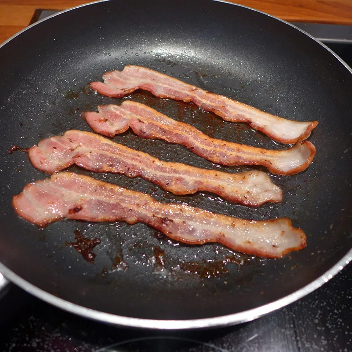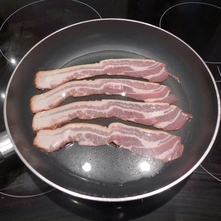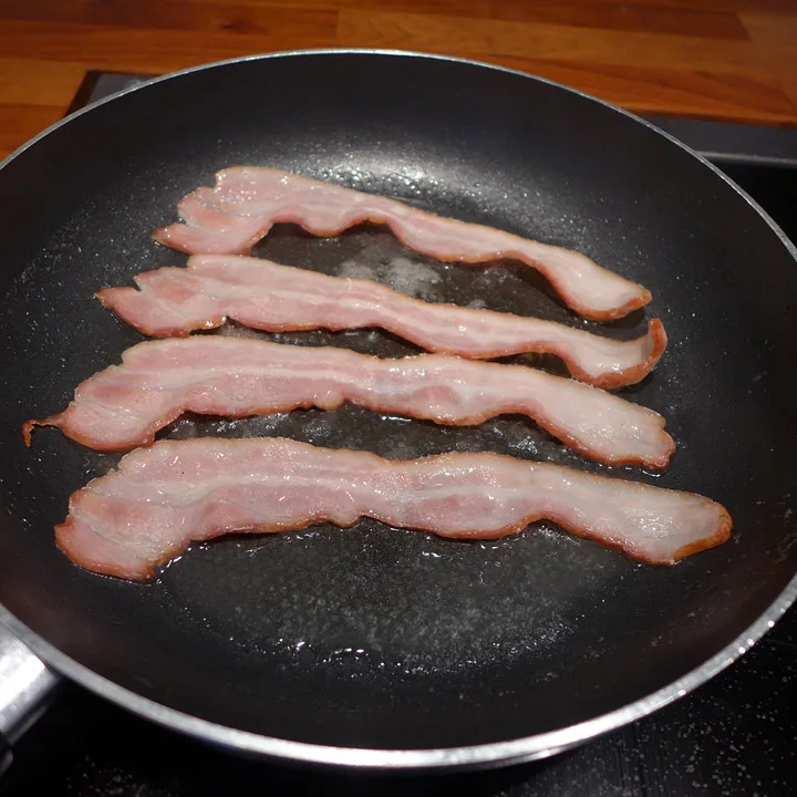 Resultatet ble smakløst. Baconet smakte papp og alt saltet var skylt bort. Baconsteking på vanlig måte med medium varme fungerer bedre.