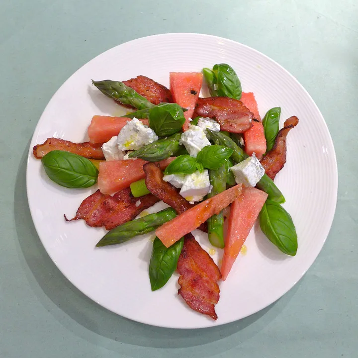 Dander asparges, vannmelon og bacon på en tallerken. Pynt med friske basilikumblader. Del biter av askechevre (dette er en kremete og mild geitost som egner seg til denne salaten). Ha litt god extra virgin olivenolje over salaten + noen dråper sitronsaft og litt flaksalt.