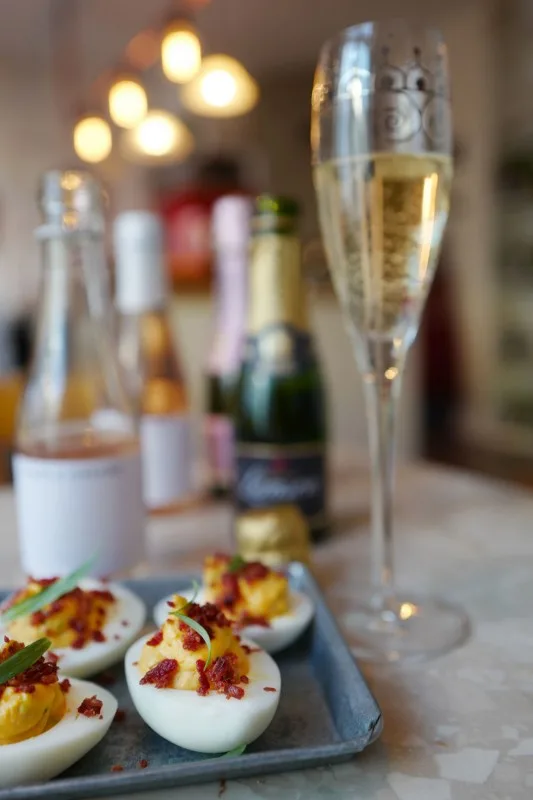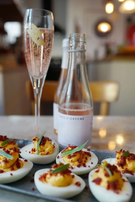 Mine deviled eggs består av majones, chili, estragon og sprøstekte krummer av pata negra spekeskinke. Disse eggene ser både lekre ut og smaker fantastisk. Dessuten passer de så godt til musserende vin og champagne.