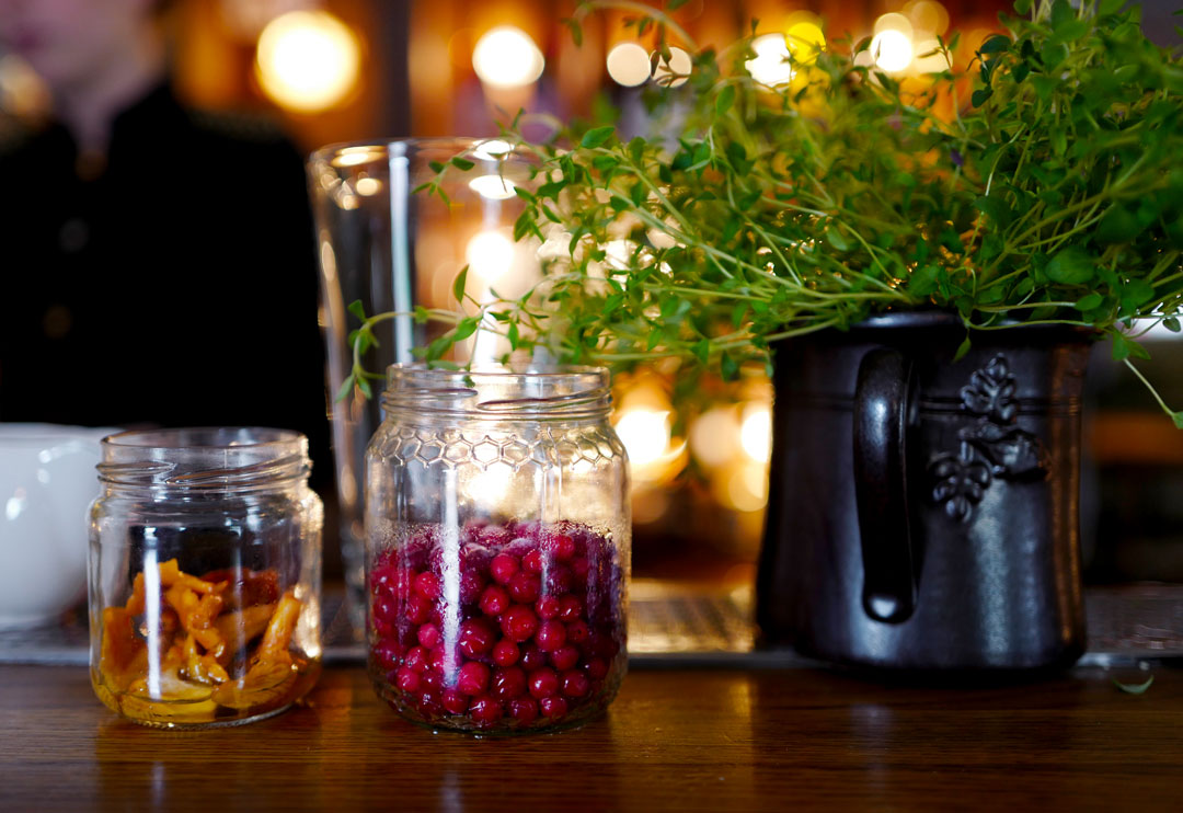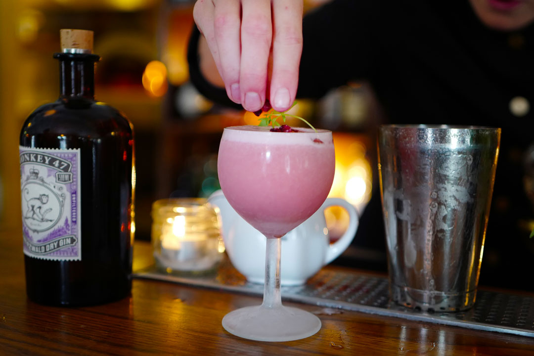 I midten: Honning, Monkey 47 gin, sitron, eggehviter, tyttebær og timian.