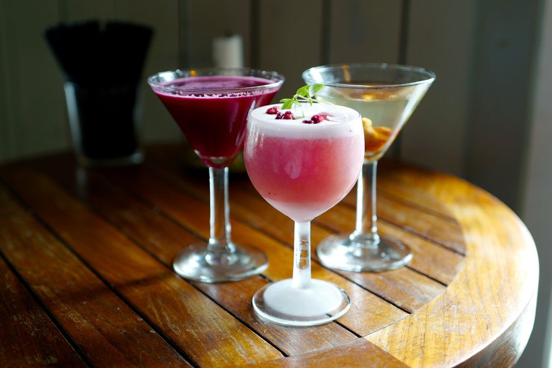 Til venstre: Rødbetesaft, lime, Luxardo Maraschino og chatreuse.