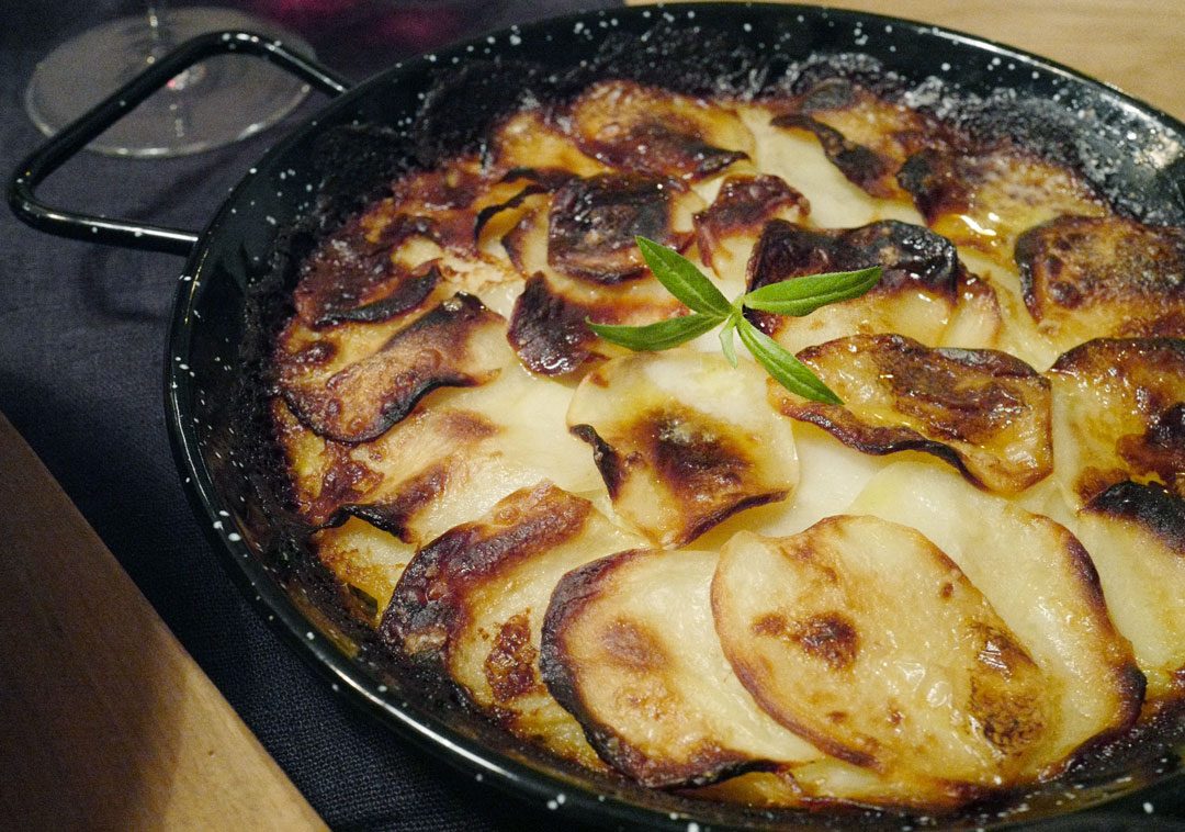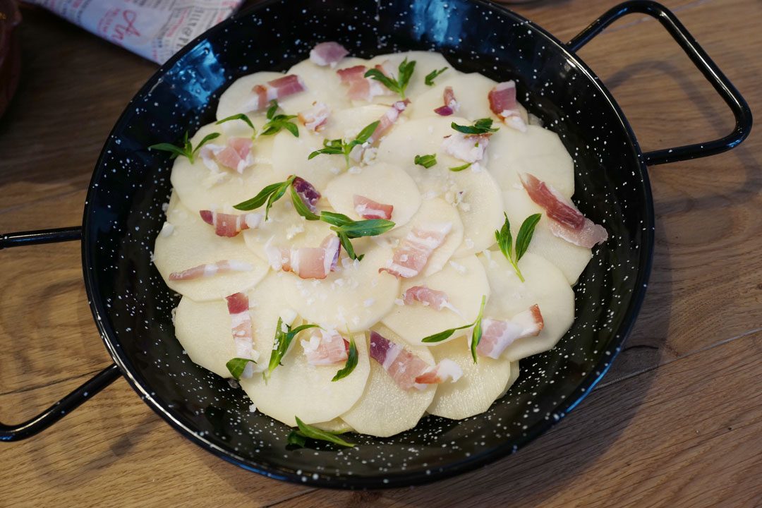 Gratinerte poteter med estragon og bacon: Med så bra kjøtt ville jeg ikke overdøve alt med masse baconsmak. Her er det viktig å begrense seg. Jeg har en potetrett jeg liker godt og den lager jeg slik: I en bred form har jeg først litt olivenolje i bunnen. Så legger jeg tynne skiver av rå potet i rosettform. Potetskivene må være like tykke, ellers steker de forskjellig. Bruk gjerne en mandolin eller siden på et rivjern. Når du har lagt to lag med poteter drysser du over 1 fedd finhakket hvitløk, litt flaksalt, litt frisk estragon og en liten neve godt bacon i små terninger. Dette skal smaksette potetene. Så legger du tre-fire lag med potet i rosettform.