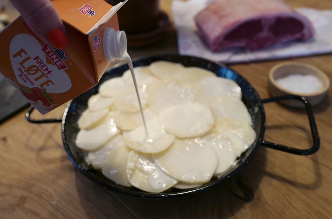 Hell over fløte slik at det dekker ca litt over halvveis i formen. Legg et par små klatter smør på toppen. Potetformen settes i ovnen på 175 grader, varmluft til potetene er møre. Det tar en timestid. Nå har du de lekreste fløtegratinerte potetene i verden med et deilig hint av estragon og bacon.