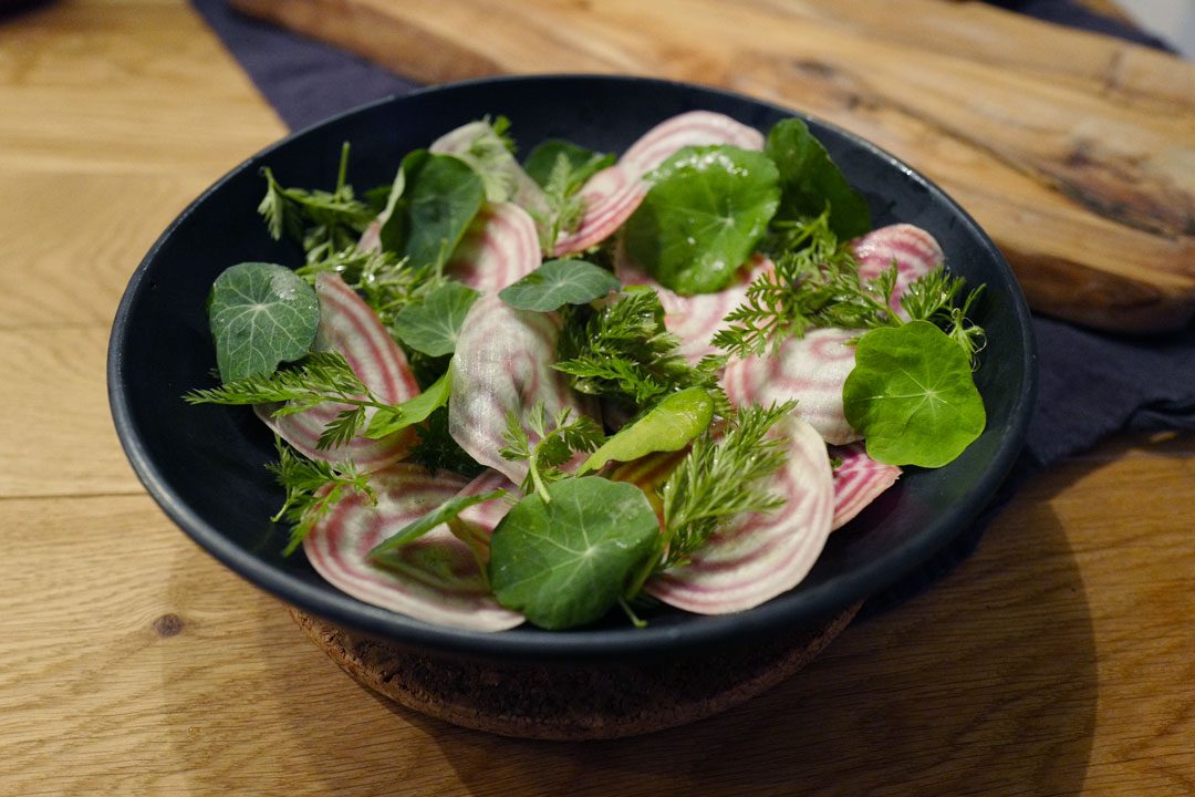 Salat: Skjær tynne-tynne skiver av en polkabete. Bruk en mandolin eller potetskreller. Legg dem i kaldt vann for å holde seg sprø frem til salaten skal settes sammen.
