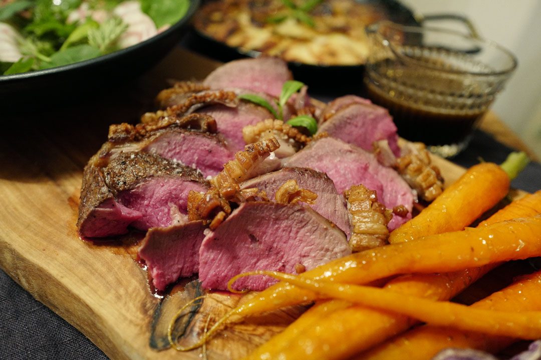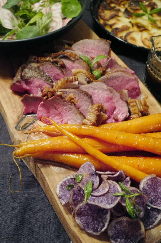 Når jeg er fornøyd med nedsmeltingen av fettet legger jeg lammesadelen over på et ildfast fat og setter det i oven på 220 grader varmluft. Sjekk kjernetemperaturen ofte. Jeg var dritnervøs for å oversteke kjøttet og jeg ga meg da temperaturen viste 51,8 grader. Det er jeg glad for, for etter at kjøttet hadde hvilt og jeg skar ut filetene, var resultatet helt perfekt. Mørt, rosa og aldeles fantastisk. Fettlaget var sprøtt og fabelaktig. Det ligger en sene under fettlaget, men det er lett å skjære bort. Det krispy fettlaget, som er selve påskegodtet, må du sørge for å servere.