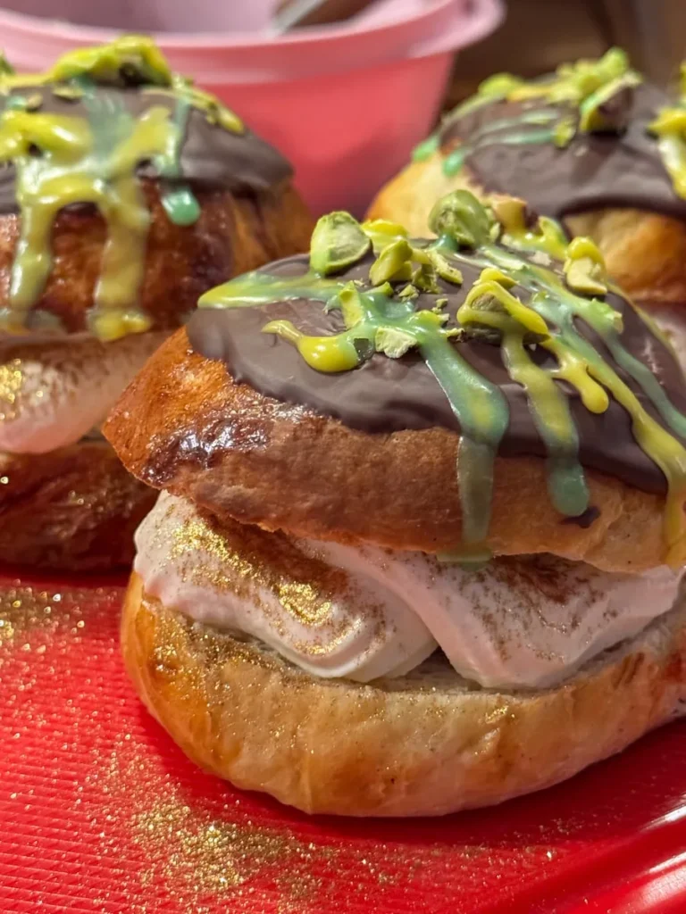 - Hul ut underdelen på bollene og fyll lommene med Dubai-sjokolade-fyll. Så dekorerer du med gullpulver og setter topplokket på. Voila! Nå har du laget Dubai-fastelavnsboller!
