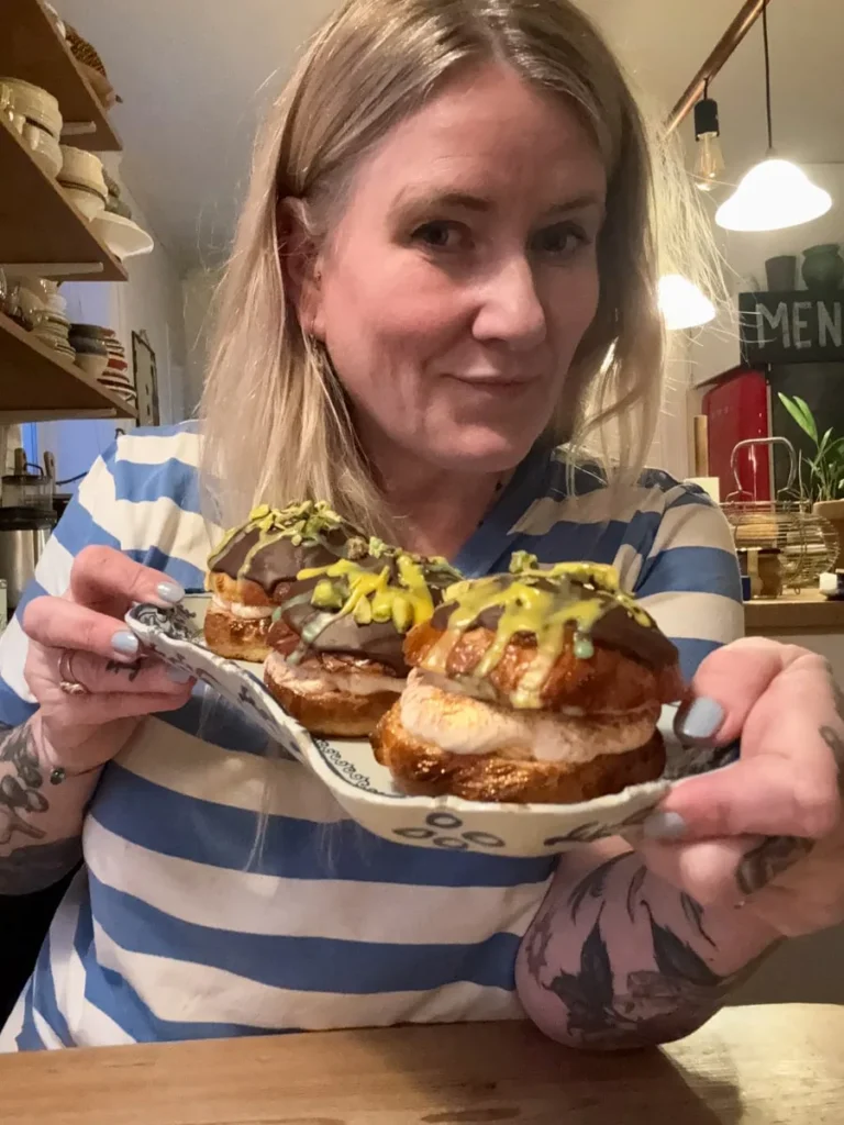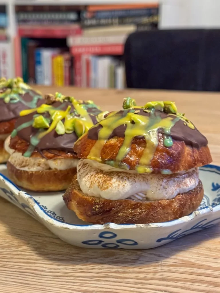 Herregud, jeg har hatt det gøy med denne Dubai-sjokoladegreia. Du husker kanskje at jeg lagde Habibi-hjerter i går? Altså små Dubai-sjokolader i konfektstørrelser? Jeg hadde fyll igjen og da ville jeg lage noe annet gøy med det. Og det gjorde jeg jammen meg. Det er fastalavnstid og neste søndag er det tradisjon å spise fstelavnsboller her i landet. I København har de holdt på i en måned (og mer) allerede. Leste du reportasjen min derfra om de kreative bollene og ikke minst fastelavns-halvmaratonløpet? Ikke det? Da har du sjansen her.