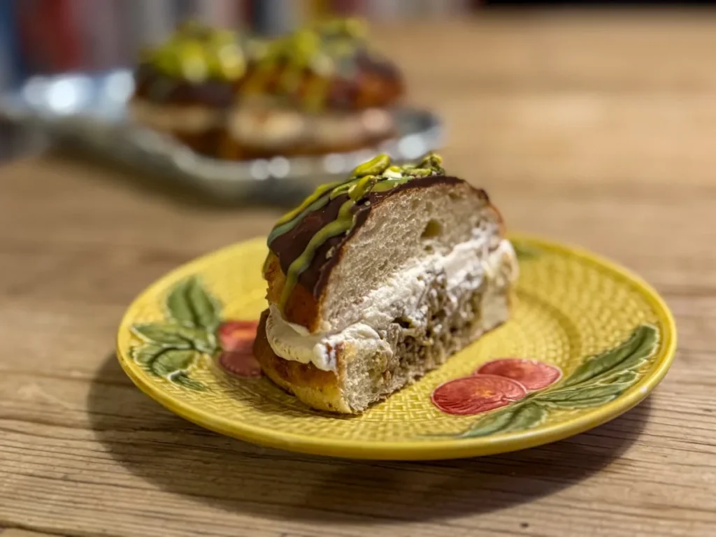 - Del bollene i to. Dypp topplokket i sjokolade og sett på et brett. Strø over hakkede pistasjnøtter. Sett kjølig så sjokoladen setter seg.