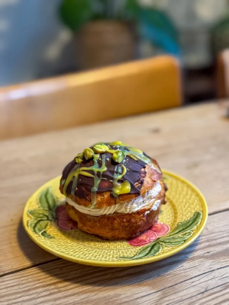 Hva annet er over toppen? Jo, Dubai-sjokoladen. Da måtte jeg jo lage en fastelavnsbolle Dubai-style. Det ble godt. Veldig godt! Den er mektig. Og man friske den opp med enten å bruke noen ferske bringebær (eller rørte bær) eller litt sitronkrem. Jeg kjørte på med pisket krem, sjokoladetrekk, hakkede pistasjnøtter og gul og grønn glasur-pynt. Og selvsagt gullpulver. Her er det bare å pøse på med stæsj!
