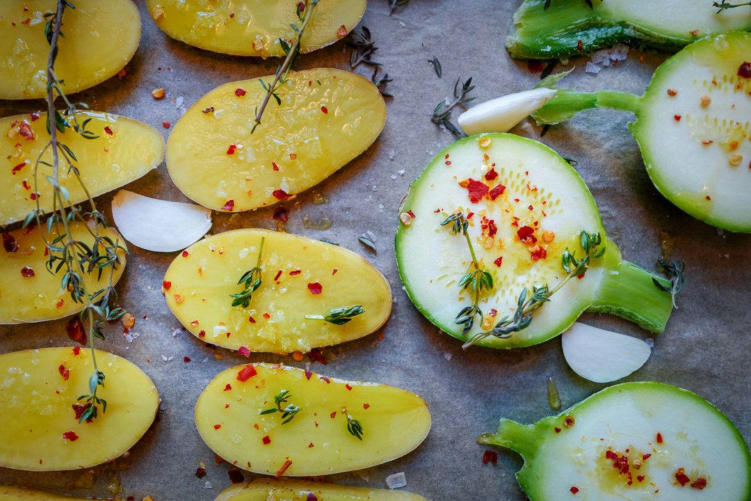 - Start med å legge potet- og squashskiver på et stekebrett med bakepapir på. Hell over litt god olivenolje. Krydre med salt, pepper og chiliflak (hvis du ønsker det). Sett i forvarmet ovn på 200 grader i ca 20 minutter eller til skivene er gylne og gjennomstekte.
