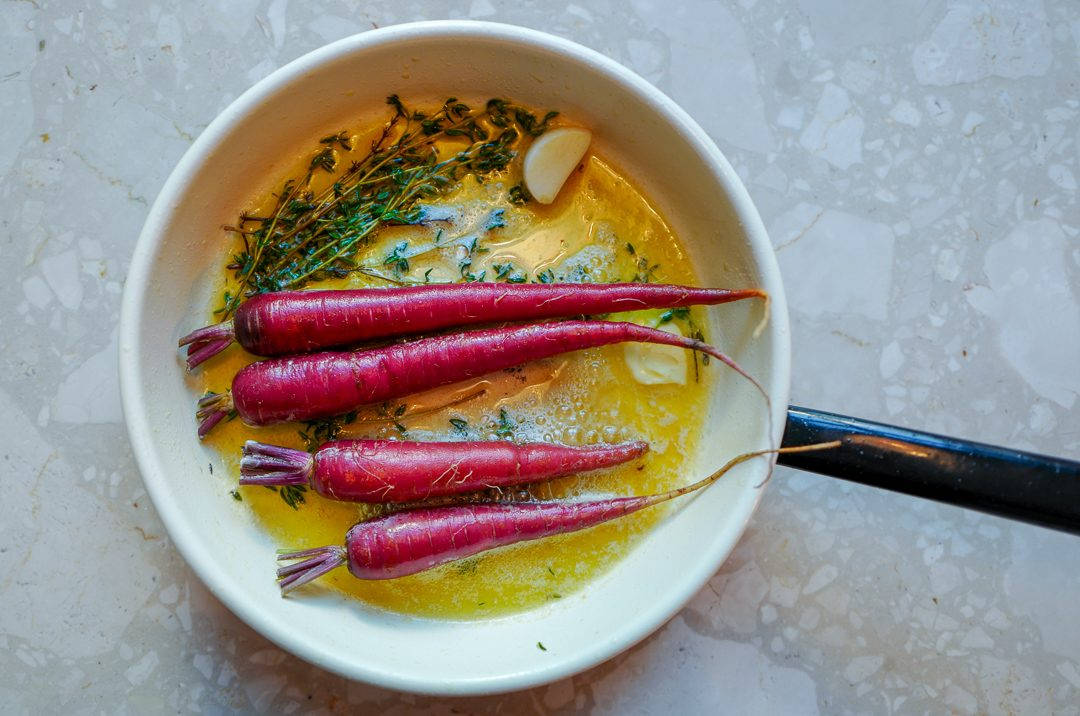 - Vask og skrubb gulrøttene. Legg dem i pannen med litt en smørklatt og et par spiseskjeer olje. Jeg liker å ha timian og hvirløk i pannen for smak. Stek et par minutter og dekk dem halvveis med vann. La trekke seg møre under omristning til vannet er kokt inn.