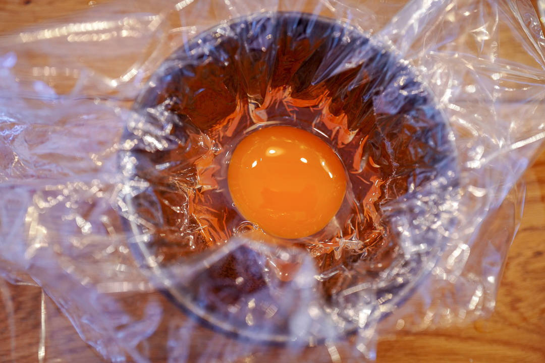 - Eggene: Lag fire doble ark med plastfolie. Pensle med olje og stikk dem ned i et glass og knekk et og et egg i glasset slik at eggeplommen og -hviten havner i midten av plastfolien. Knyt igjen plasten med strikk eller hyssing slik at du får en liten pose. Nå kan eggene posjeres i kokende vann. Dette tar ca tre minutter. Andeegg er større enn hønseegg, så hvis du bruker hønseegg bør du ikke ha eggen i vannet lenger enn 2 1/2 minutter.