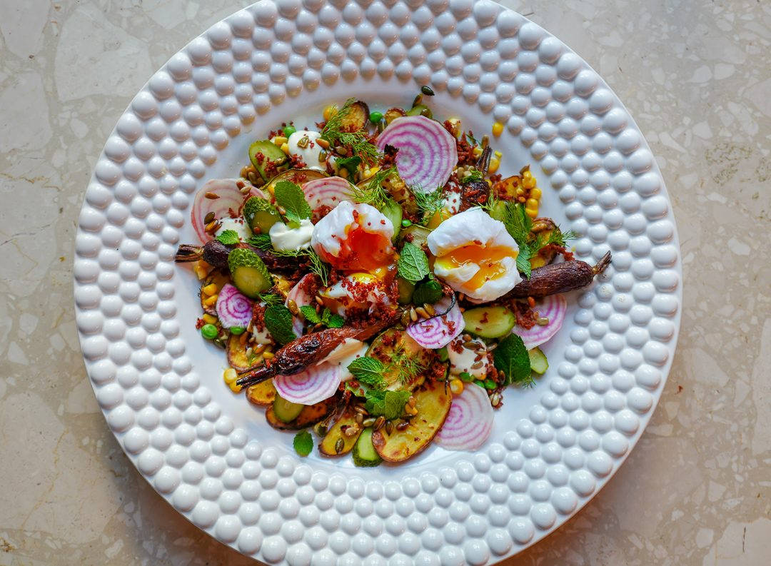 Det høres ut som mange ingredienser, men husk: Jeg har ikke en kilo av hver. Et par poteter kommer du langt med. Det samme med en liten squash og et par gulrøtter. Jeg vil ha en salat med overraskelser i hver bit, ikke en kjedelig og forutsigbar salat.