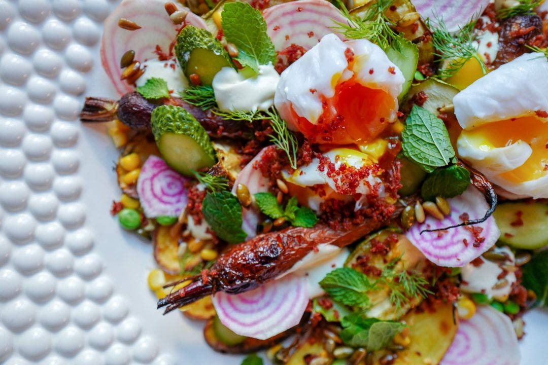 - Legg på eggene. Dryss over bacon og ristede frø eller nøtter. Legg på små klatter av dressing og masse deilige urter.