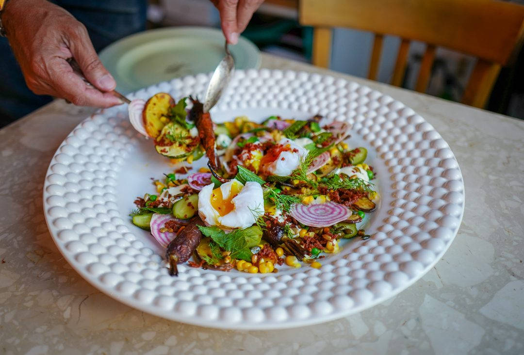 Anne Karin på Bondens Marked hadde andeegg. Hos min lokale grønnsakshandler fant jeg norsk mais, poteter, små agurker og erter. Kvalitetsbacon fra A. Idsøe plukket jeg opp i en delikatessebutikk på Frogner. I kjøleskapet hadde jeg frisk mynte, hvitløk, rørosrømme og en liten dillkvast.