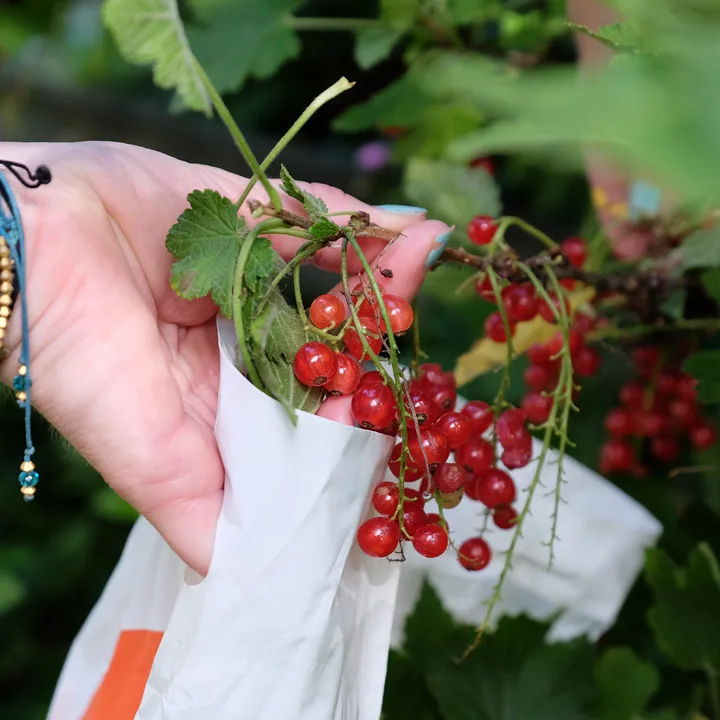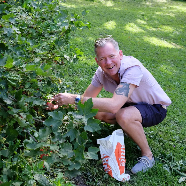 Jeg har vært på slang. Det er fordi jeg ikke liker å se at fristende bær og frukt bare står der uten å bli plukket. Dette med slang er egentlig litt overdrevet, fordi dette faktisk var arrangert slang. Det startet for et par uker siden. Erik og jeg gikk tur på Frogner, slik vi ofte gjør siden vi bor her, men så gikk vi forbi hagen til Steinerhøyskolen. Den hadde vi aldri lagt merke til før. Hagen bugnet av fristende rips, stikkelsbær, masse grønnsaker og blomkarse. Jeg gikk hjem og skrev en mail og spurte om det var lov å gå på slang i hagen, for nå var alle bærene ferdige til å bli plukket. Som svar fikk jeg at denne hagen er en del av elevenes skoleprosjekt og innhøstningen foregikk til og fra nå i sommerferien. Men jeg var mer enn velkommen til å gå på slang og ta noen rips til dessert. Så derfor gikk jeg altså på slang og tok med meg litt rips og noen blomkarser. Det var flere på slang denne lørdagen, og bærbuskene var så og si ribbet for bær, men vi fikk en stor neve rips.