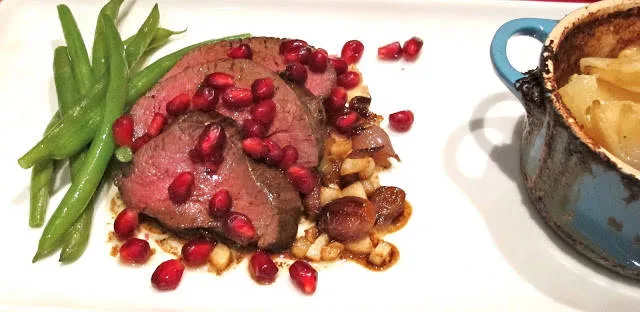Jeg serverte elgen med granateplefrø, også kalt «Midtøstens tyttebær» (oppkalt av meg her og nå…), pannestekte små biter av persillerot, balsamicokokte småløk, smørdampede aspargesbønner og en gratinert potetform med bacon og persillerot. Oppskrift på potetformen finner du her: gratinerte poteter