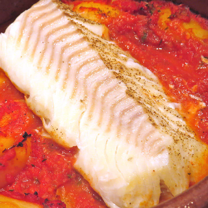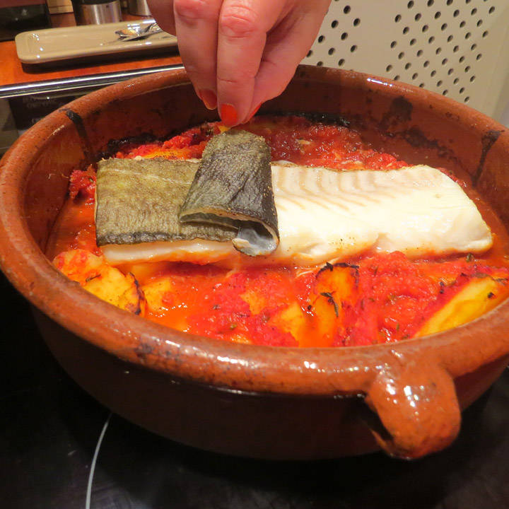 Så tilsetter du det du måtte ønske av protein: Fisk, kjøtt eller pølser. Et stort og herlig torskestykke som jeg har her saltes og pepres og legges på toppen av formen. Pga tykkelsen på torskeryggen, trengte denne nesten 20 minutter i ovnen. Det er lett å sjekke med en tynn kniv og se om fisken er gjennomstekt. Riv av skinnet når fisken er ferdig og server.