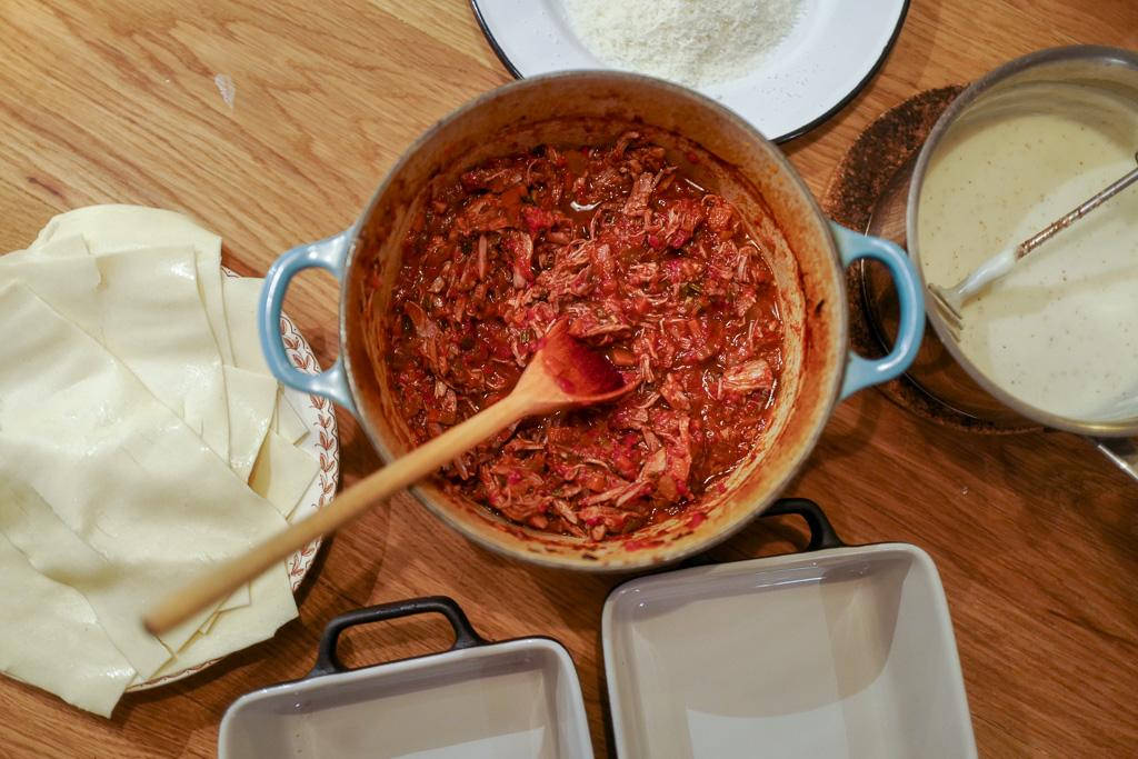 La dette småputre under lokk i to timer på 150 grader i ovnen. Hvis kjøttet løsner fra beina tar du dem ut og renser dem for kjøtt. Kast bein og skinn. Ha kjøttet tilbake i gryten. Bland inn sherry og la stå mens du forbereder pastaplatene og bechamelsausen.