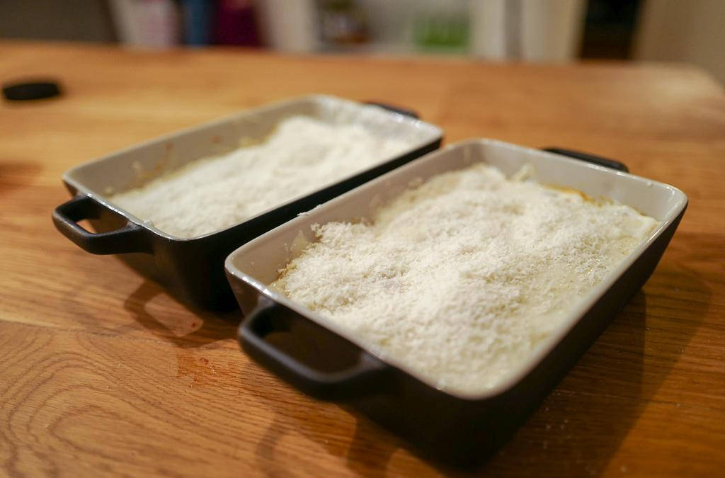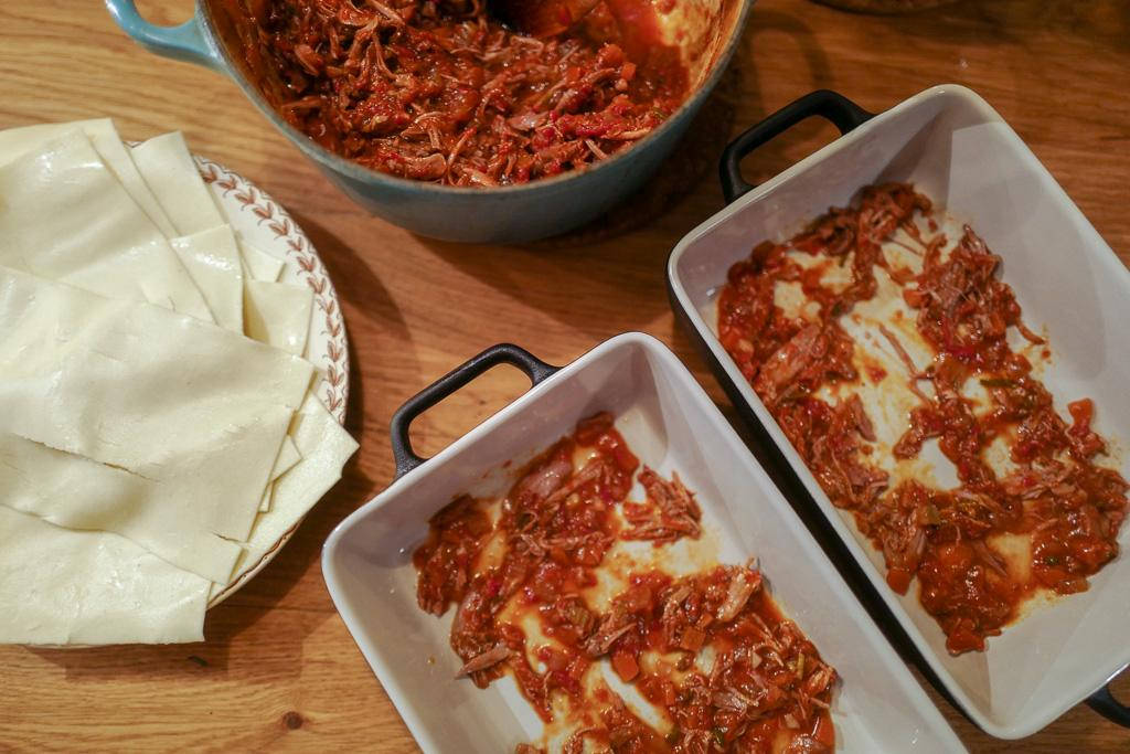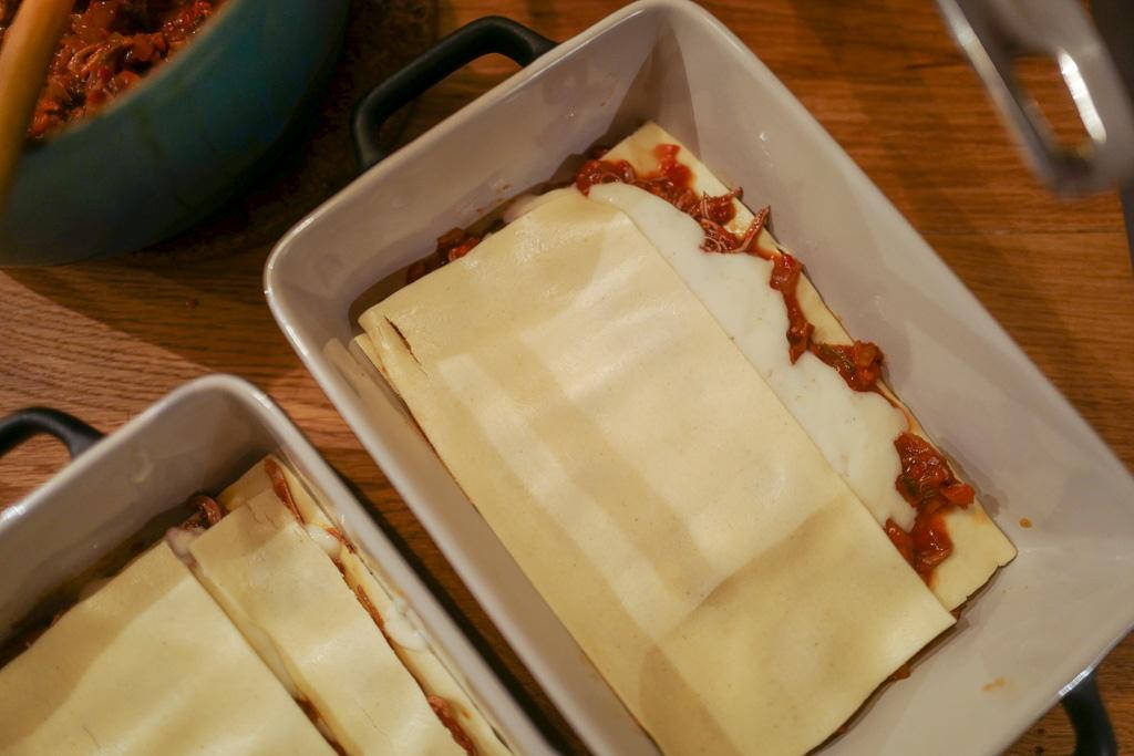 Da begynner monteringen av lasagnen. Du smører litt ragusaus i bunnen på den ildfaste formen slik at pastaen ikke brenner seg fast. Legg så et lag pastaplater på. Så legger du et lag med ragu og et lag med bechamelsaus på. Nytt lag med pastaplater, resten av anderaguen og nesten alt av bechamelsaus. Legg et siste lag med pastaplater og smør resten av bechamelsausen på toppen. Strø ost over og sett i ovnen på 180 grader i ca 40 minutter eller til den bobler og er perfekt brunet.