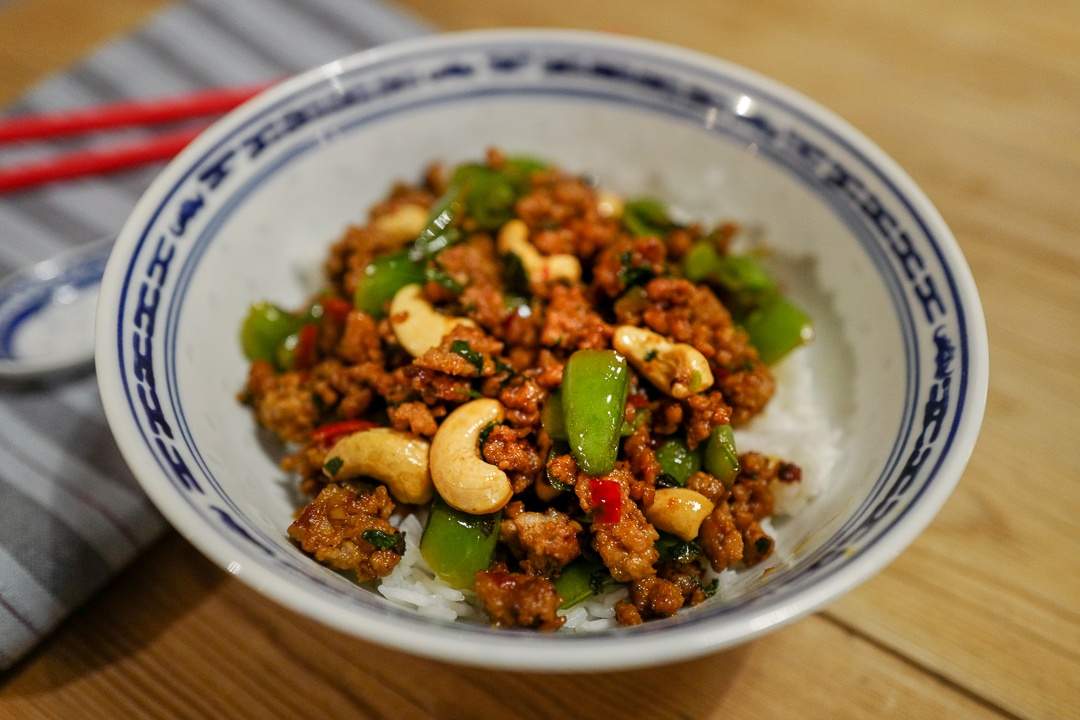 - Stek kjøttdeigen i olje til den blir gyllent. Tilsett appelsinsaft, revet hvitløk, sitrongress og ingefær. Rør og la appelsinsaften koke litt inn. Hell på soyasaus og Sambal Oelek, fiskesaus og tilsett chili. Rør godt og la steke litt til før du tilsetter sukkererter (oppkuttet eller hele). Grovhakk urter og ha i retten sammen med cashewnøtter og sesamolje.