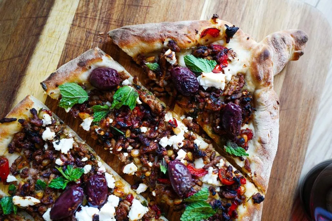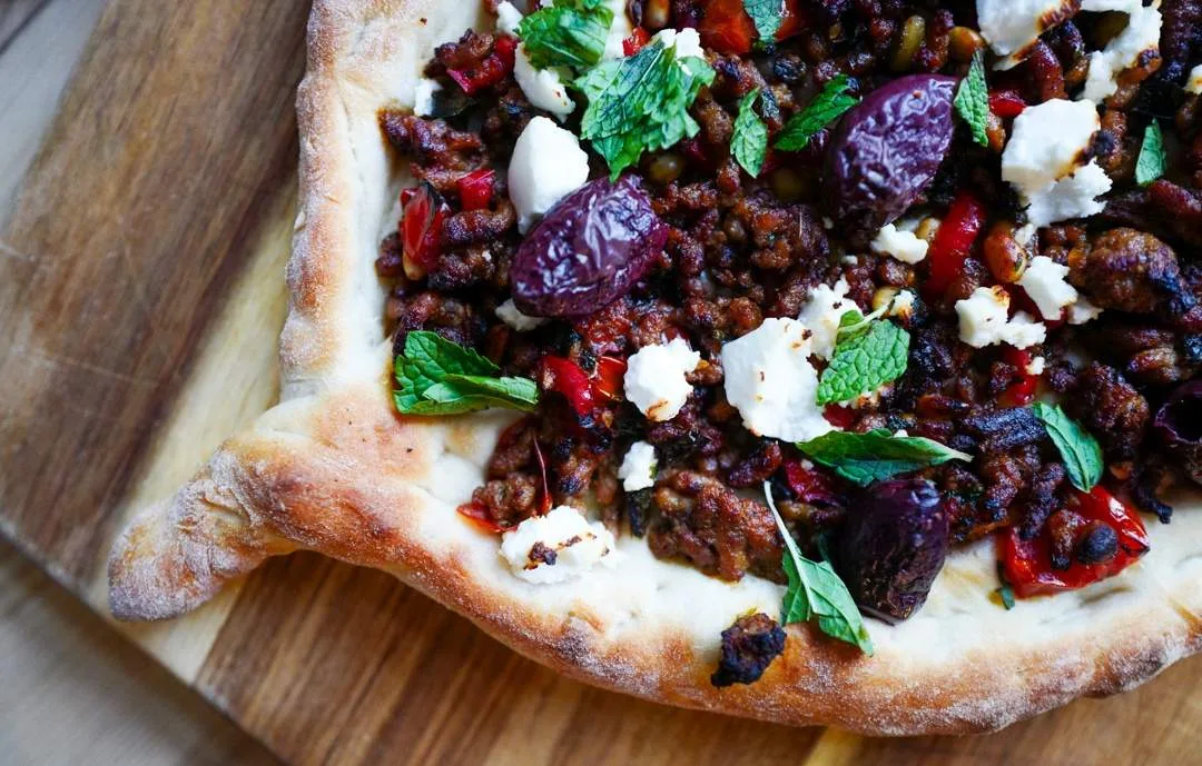 - Fordel kjøttmiksen utover 2 stk deig som er formet som pide. Strø over oliven, tomater og smuldret fetaost.