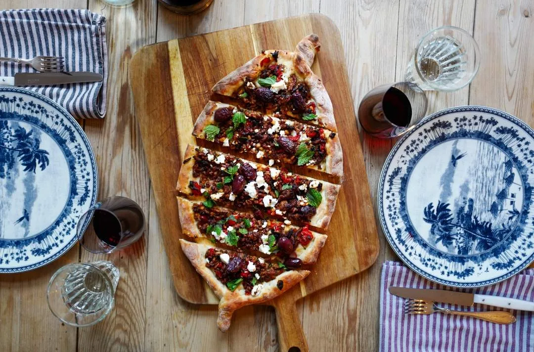 - Fordel kjøttmiksen utover 2 stk deig som er formet som pide. Strø over oliven, tomater og smuldret fetaost.