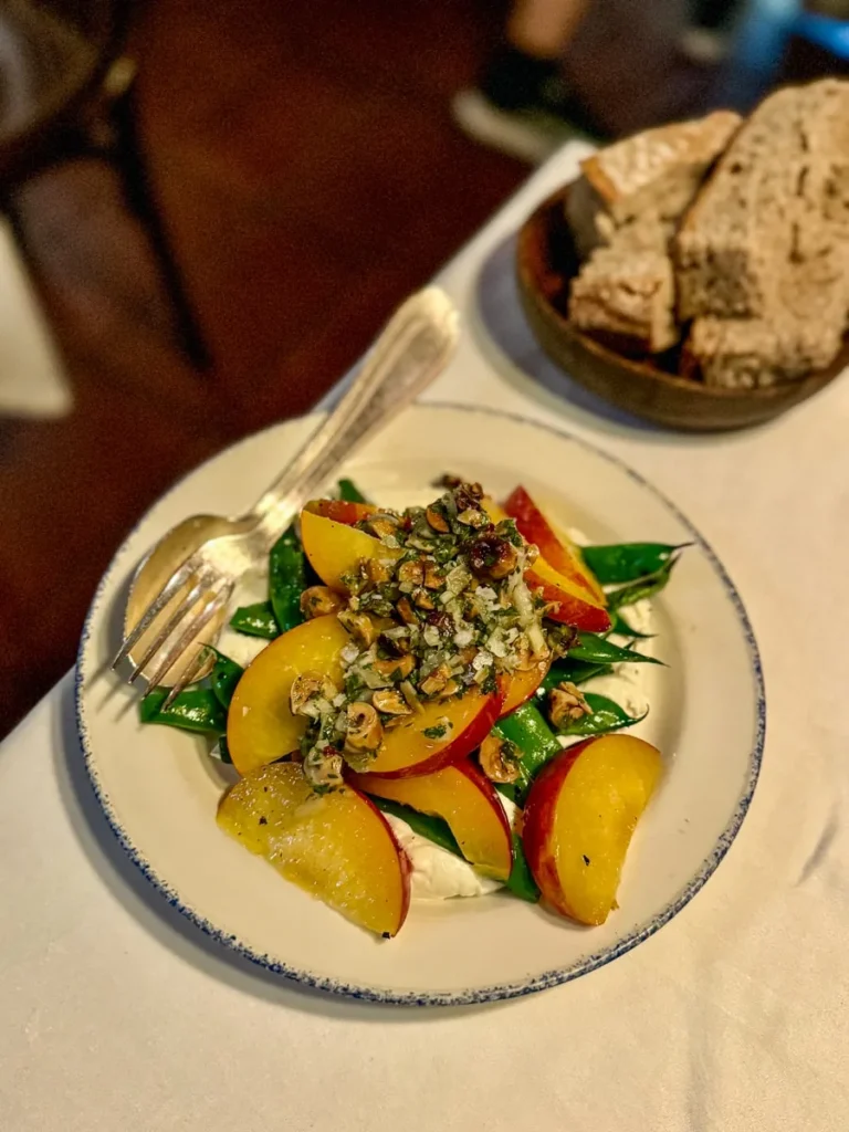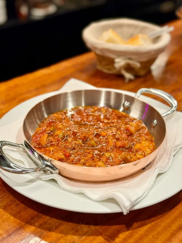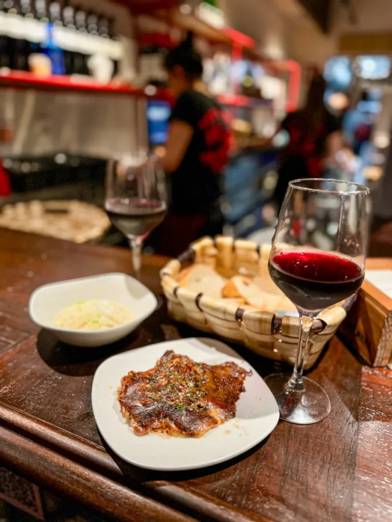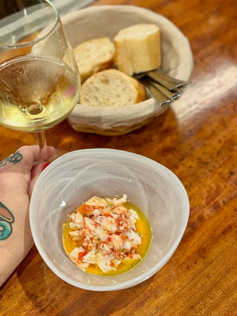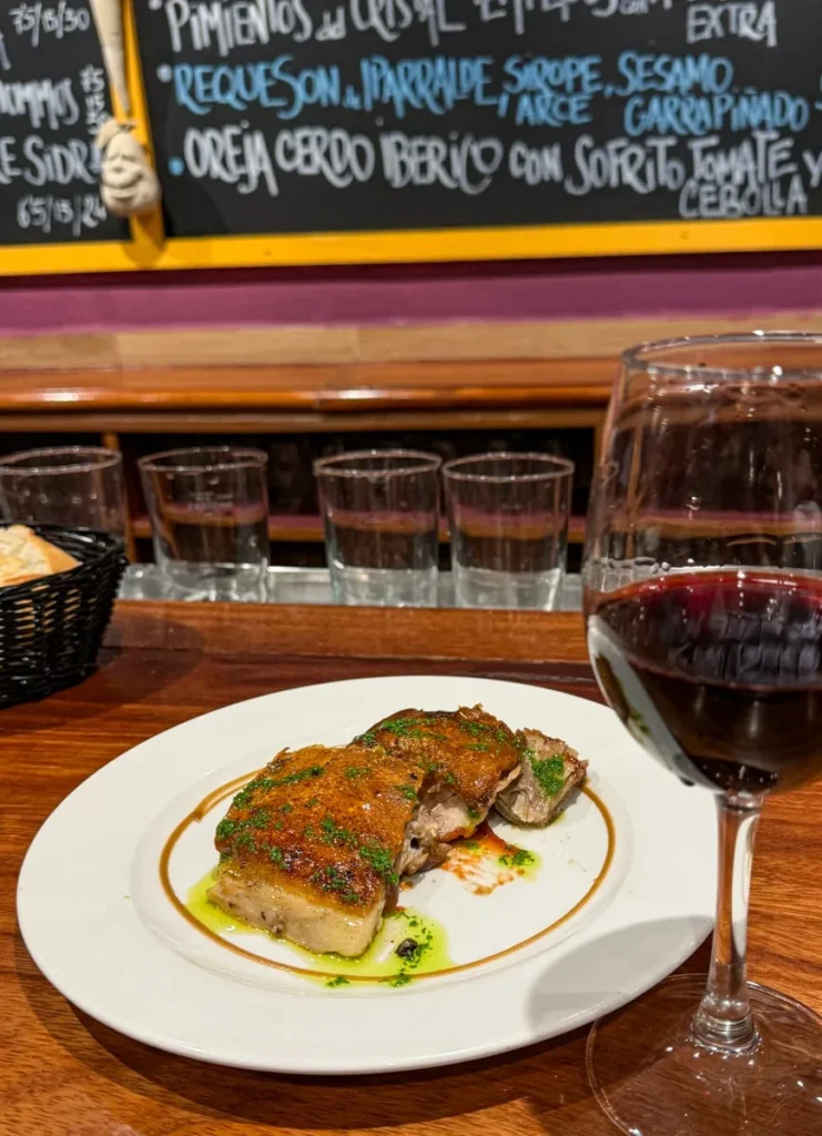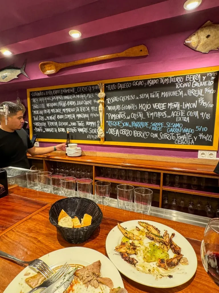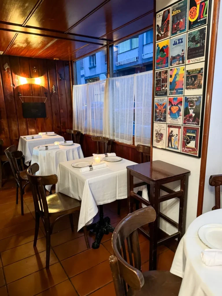 I kjelleren ligger Michelinrestauranten signert Paulo Airaudo, men i første etasje kan man komme og gå som man vil i den koselige baren med ekstremt bra service og trivelig atmosfære. Da jeg var der fikk jeg gleden av å spise til lyden av Neil Young og andre americana-legender. Du finner småretter i disken, men mange kan bestilles fra menyen, slik det er vanlig å gjøre når man spiser pintxos i Baskerland. Jeg smakte callos for første gang. Callos er magen fra kua som er skåret i tynne strimler og kokt lenge slik at de er møre. De lå i en deilig aromatisk saus og retten smakte helt vidundelig, synes jeg. Ikke noe å være redd for. De har også baskisk krabbe (Txangurro) på menyen og vi salpicón de bogavante, en kald hummersalat med mye syre. Elsker den. De har gode lokale viner på glass.