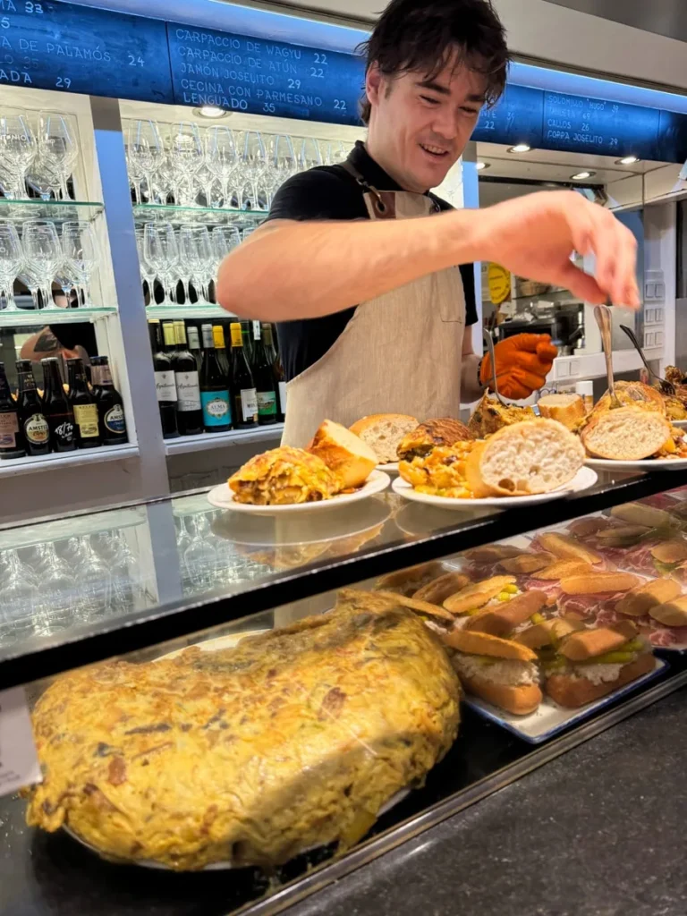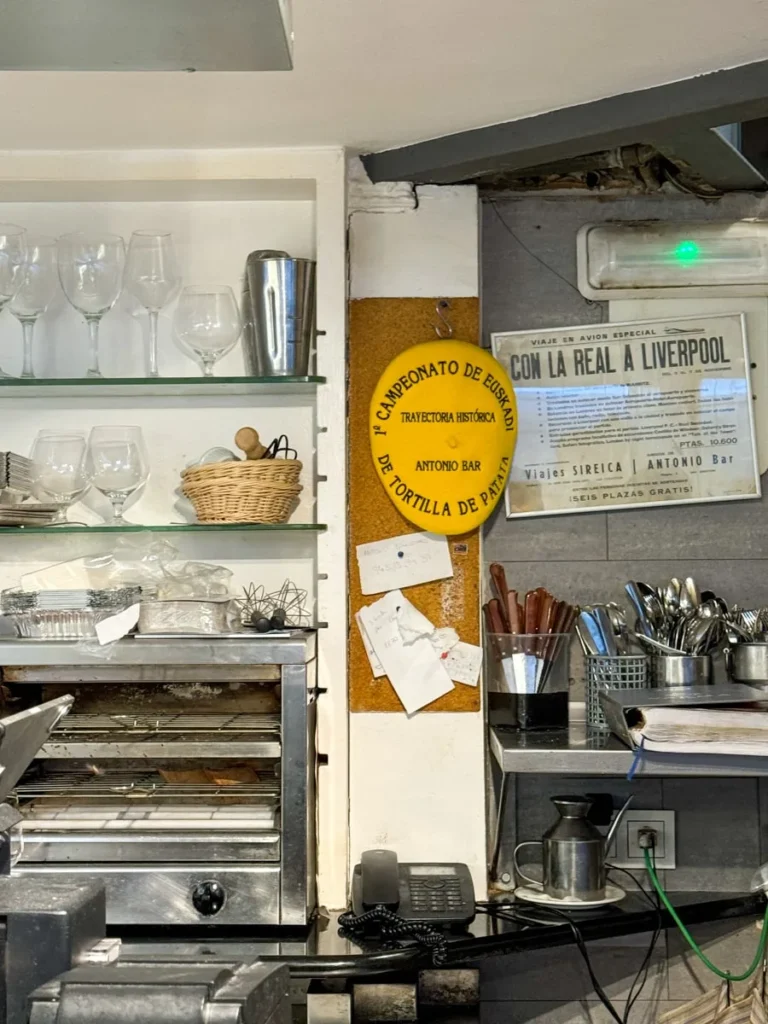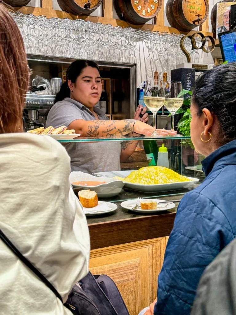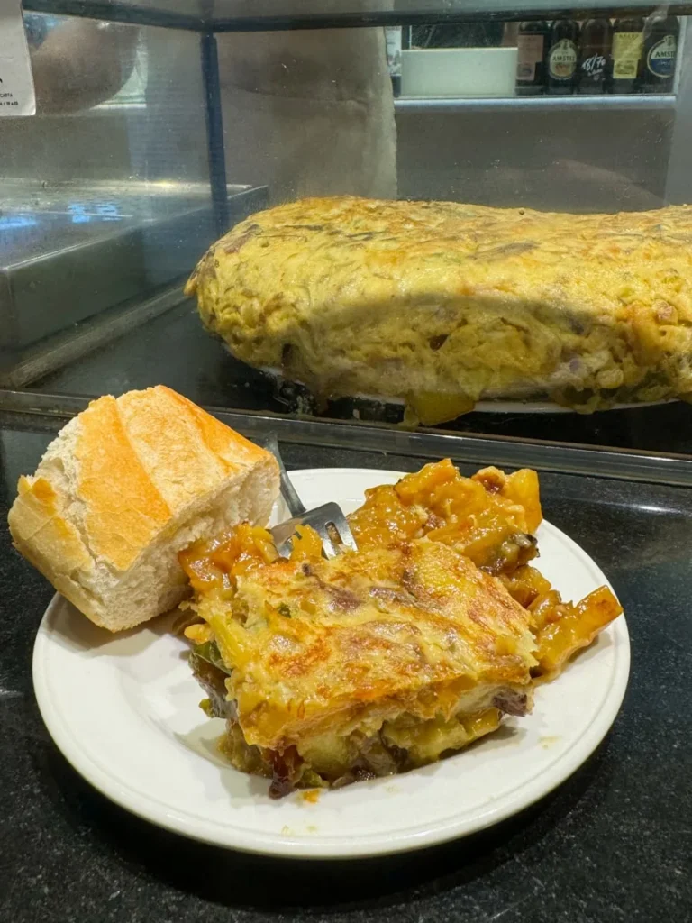 Still deg opp før de åpner dørene om morgenen og gå for tortilla de patata. De er kjent for å ha god mat generelt, men det er især omeletten som trekkes frem. Og det med god grunn. Den er spektakulær. De har et imponerende system. De åpner dørene når de er klare, og det er ikke alltid helt på klokken i forhold til det som står som åpningstid, men når de åpner så er det effektivt som faen. Folk slipes inn i den knøttlille baren, mannen bak disken tar opp kaffebestillinger med et smil og så venter vi på at tortillaen skal komme fra kjøkkenet. Når det skjer skjæres den opp i porsjoner og server i rekordfart. Mannen bak disken har virkelig klisterhjerne som husker alle bestillingene. Det sies at hver omelett lages av 28 egg. Det stemmer sikkert. Foruten egg og potet er det også løk og spanske pepperfrukter i tortillaen. God kaffe har de også her, så en komplett frokost er innen rekkevidde.