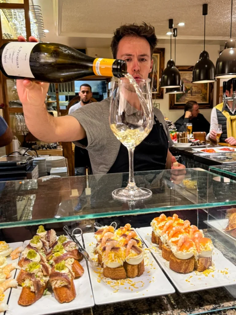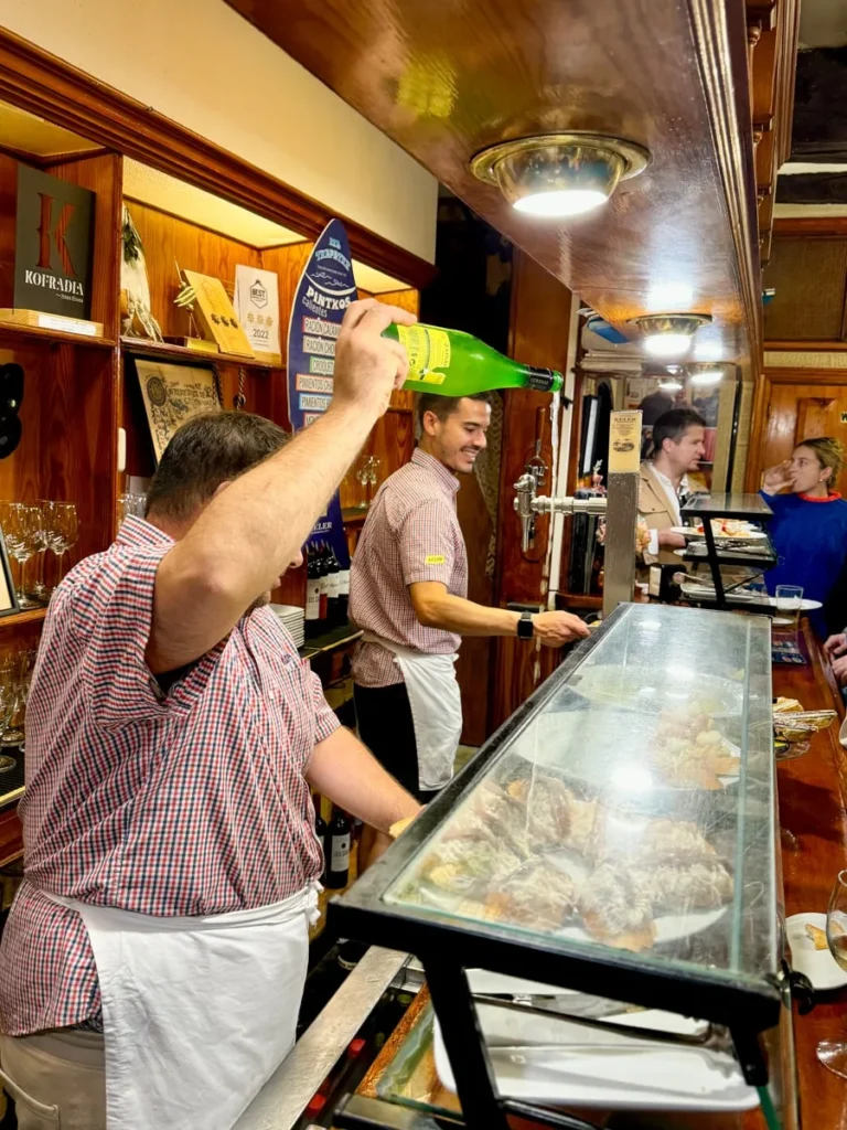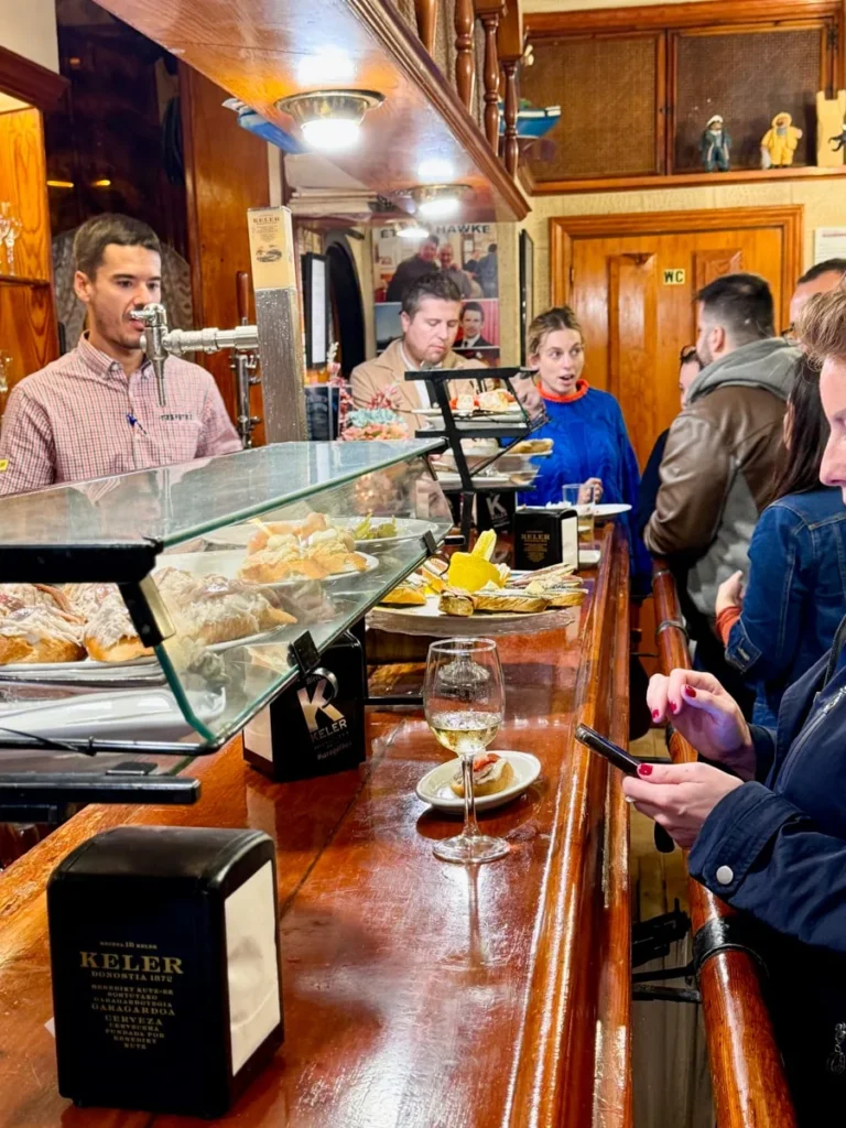 Bestill noe å drikke og en rett eller to. Merk at glassene er små, slik at du har mulighet til å ta et glass på hvert sted uten å bli stupfull. Velg den lokale perlende hvitvinen Txacoli eller et glass sider hvis du vil ha noe som er lavt på alkohol, eller et snitt øl.