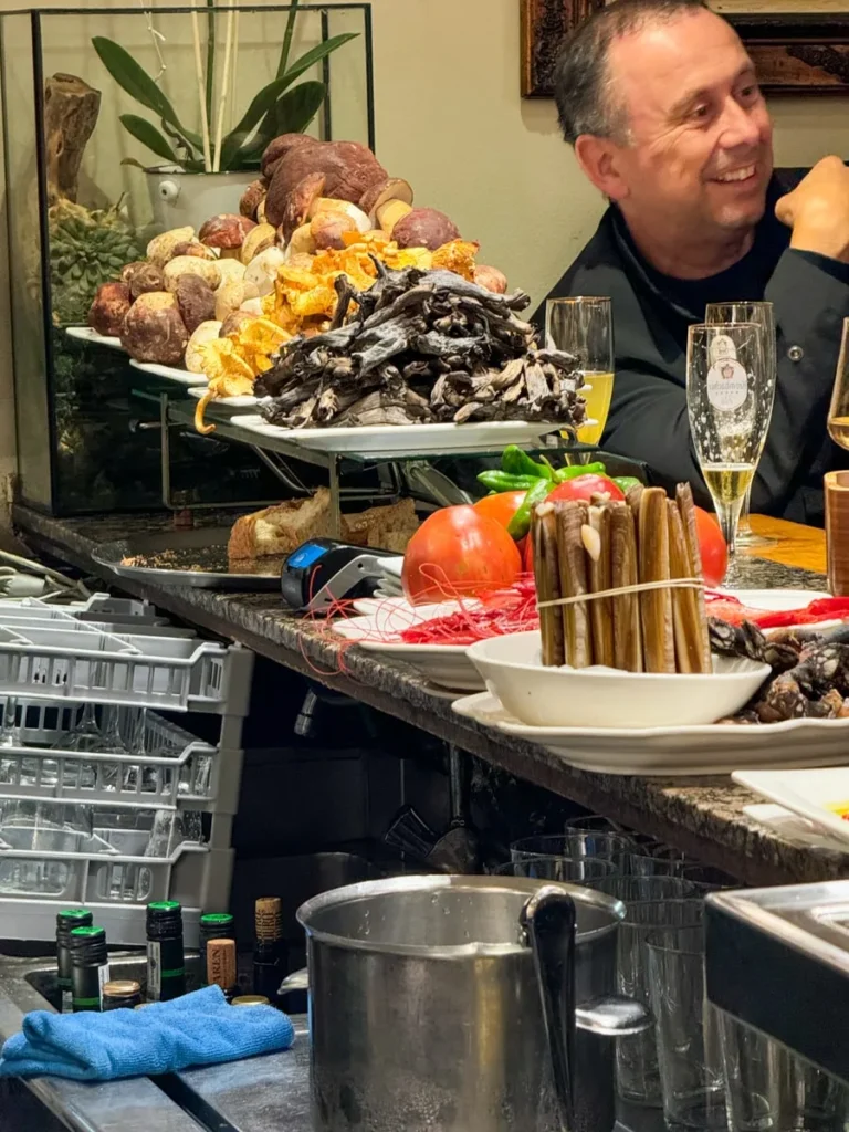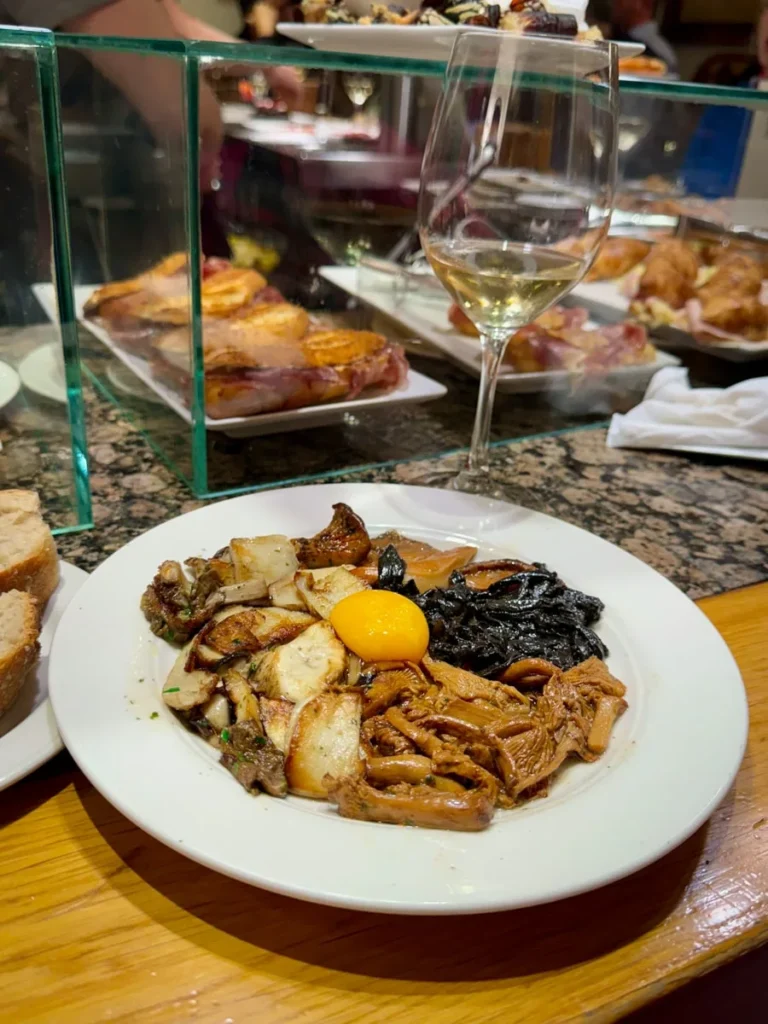 For et sted! Det bugner av sopp, sjømat og alt som er godt! Her kan du også trygt kjøpe pintxos på brød, for de lages ferske hele tiden og de er lekre som bare det. Stekt sopp med eggeplomme er en av mine favoritter. Du blander egget med soppen slik at du får en kremet og nydelig rett. Ferske andeskjell er også noe du bør bestille, for det er ikke så ofte man ser dem på menyen. Et av de aller beste stedene i San Sebastian.